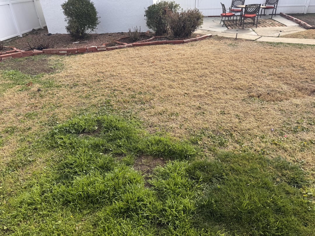 Same with the front lawn. There are two big green patches from the Fescue, then the rest of the lawn is Brownish at this time.