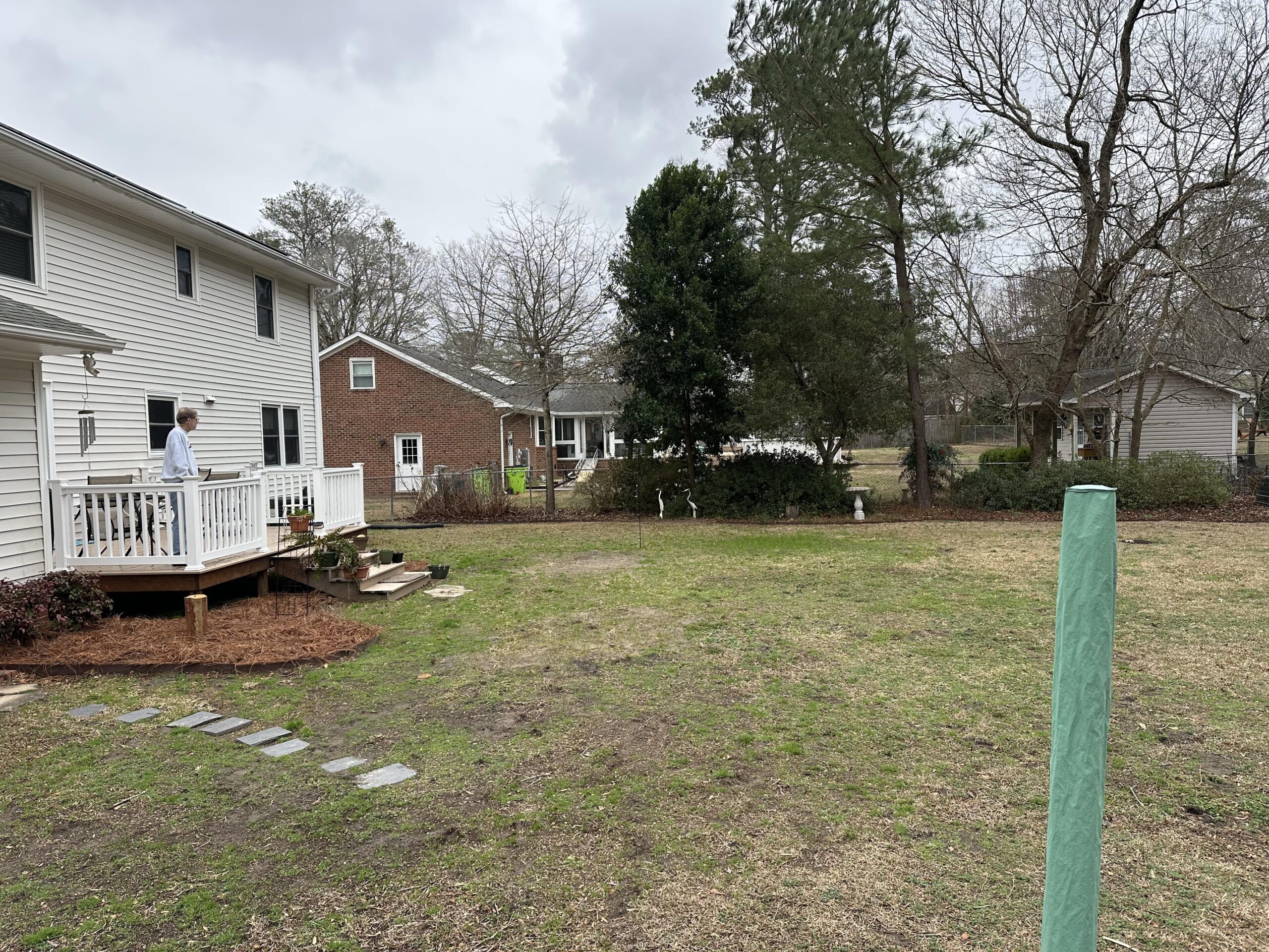 So from the green pole to the bird bath is a somewhat line of where the grass goes to more shit. I checked everything. No sign of anything. No large patch, no history of mole crickets, no septic lines. He did have a “40 ft” crepe Myrtle cut down ( see stump by customer) but that just didn’t add up to be the cause based on orientation of sun.
