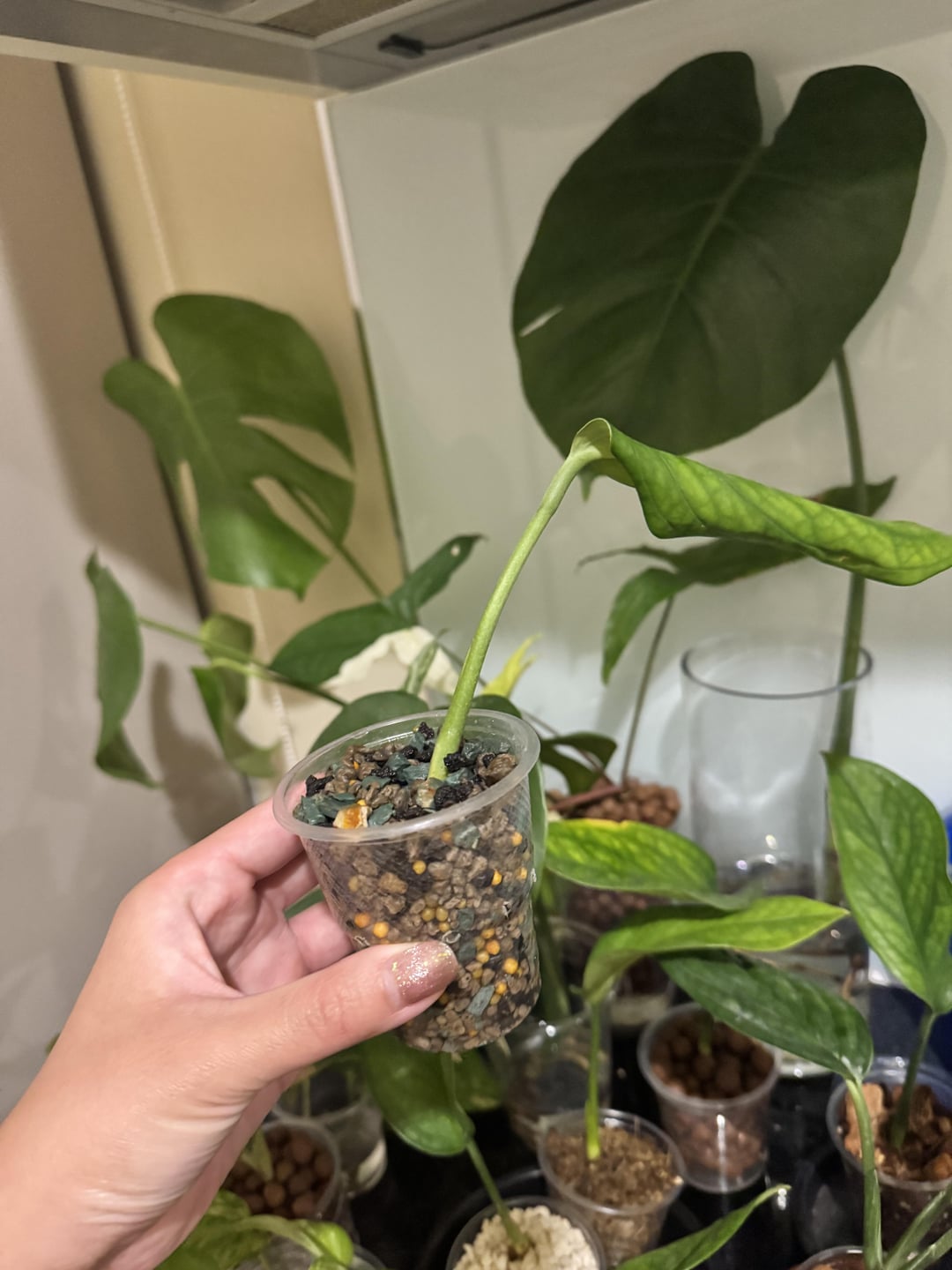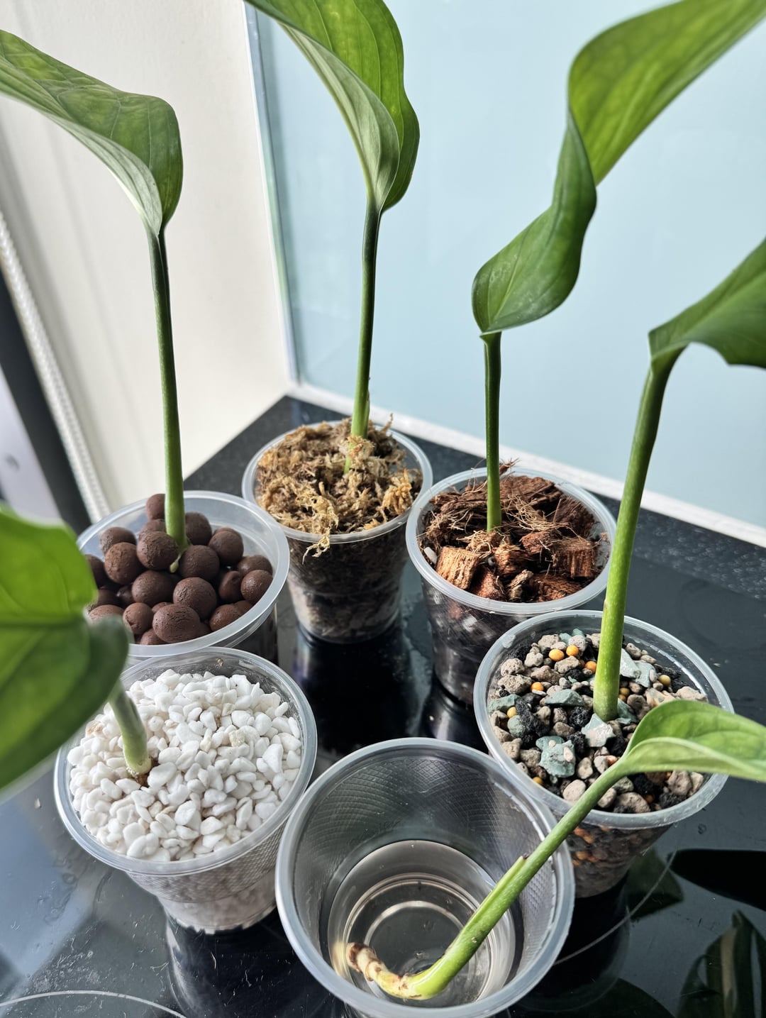 This is a 1 month update to my post about testing 6 different growing substrates for my monstera siam cuttings: [https://www.reddit.com/r/Monstera/comments/1huzvw3/running_an_experiment_on_which_substrate_will/](https://www.reddit.com/r/Monstera/comments/1huzvw3/running_an_experiment_on_which_substrate_will/)