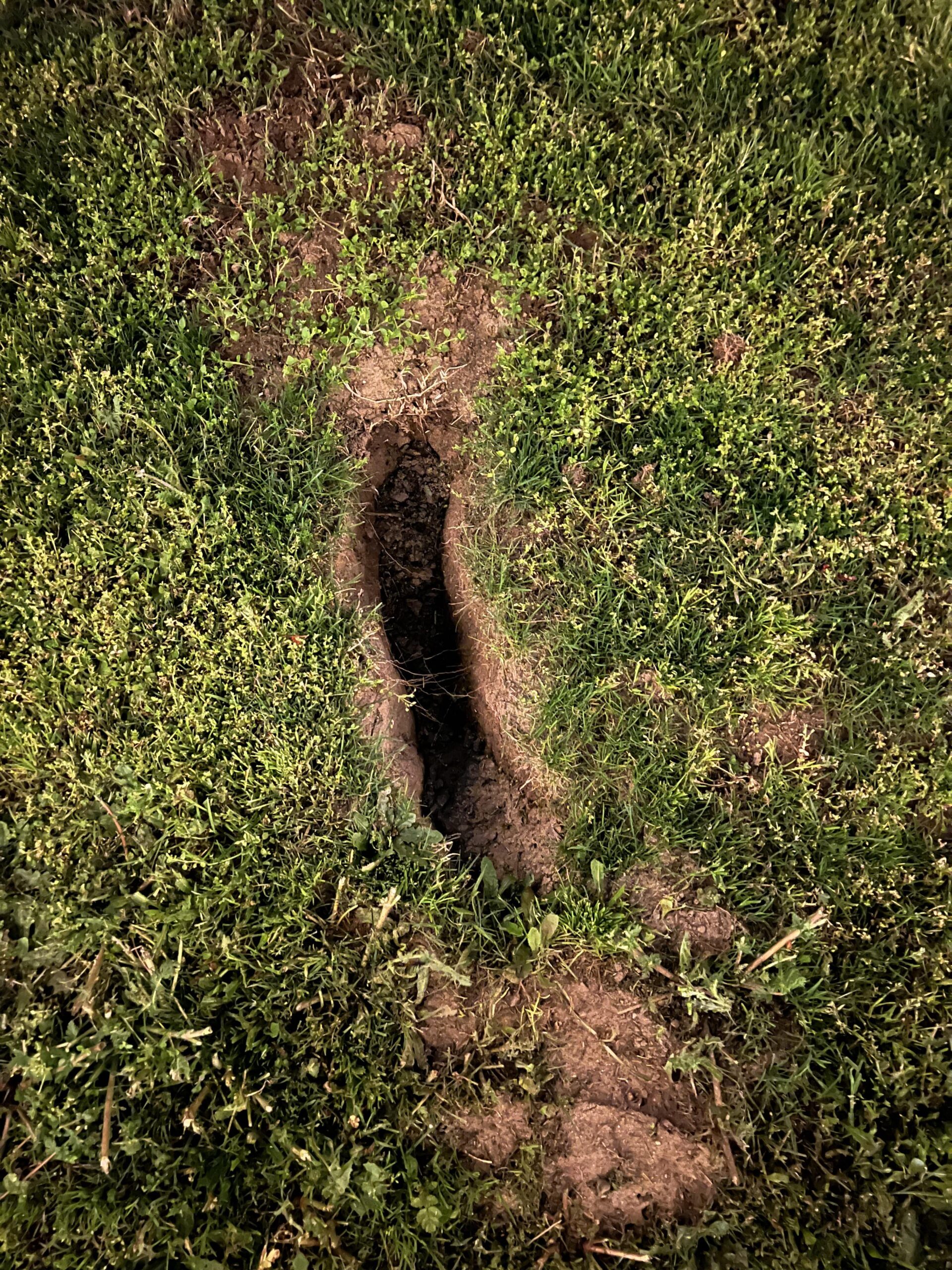 I found this hole in the lawn (backyard with brick walls) while mowing and can’t figure out where it came from. I asked the kids and they said they didn’t dig. I believe them because it’s been cold and they haven’t been out there much. Does anyone know if this possibly came from an animal? It doesn’t look like any pictures I’ve seen online. Southern California