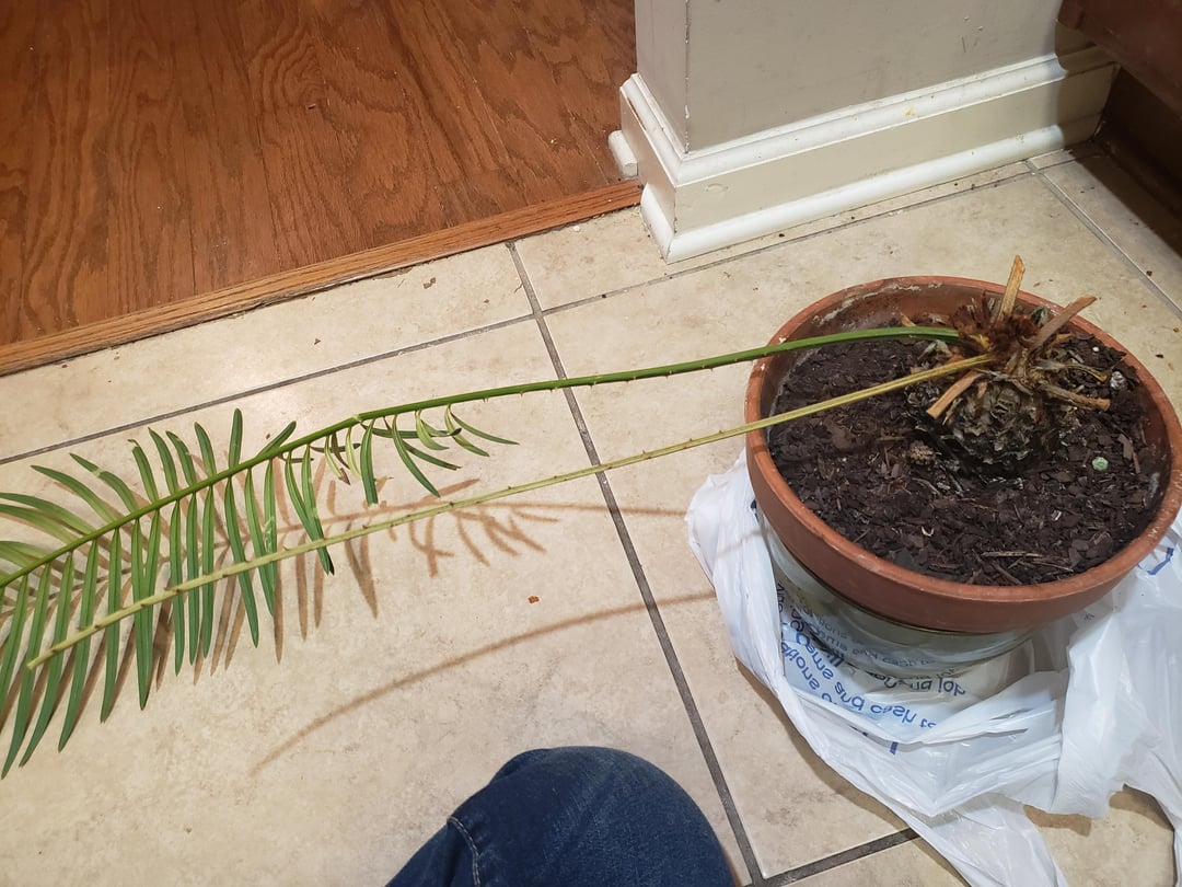 She's gorgeous but in dismal condition and I wanna save her. Google says she might be a Sago Palm? As I don't know what she is yet I don't know how often I should water her or if she should be in direct or indirect sunlight or what not, any help would be appreciated!