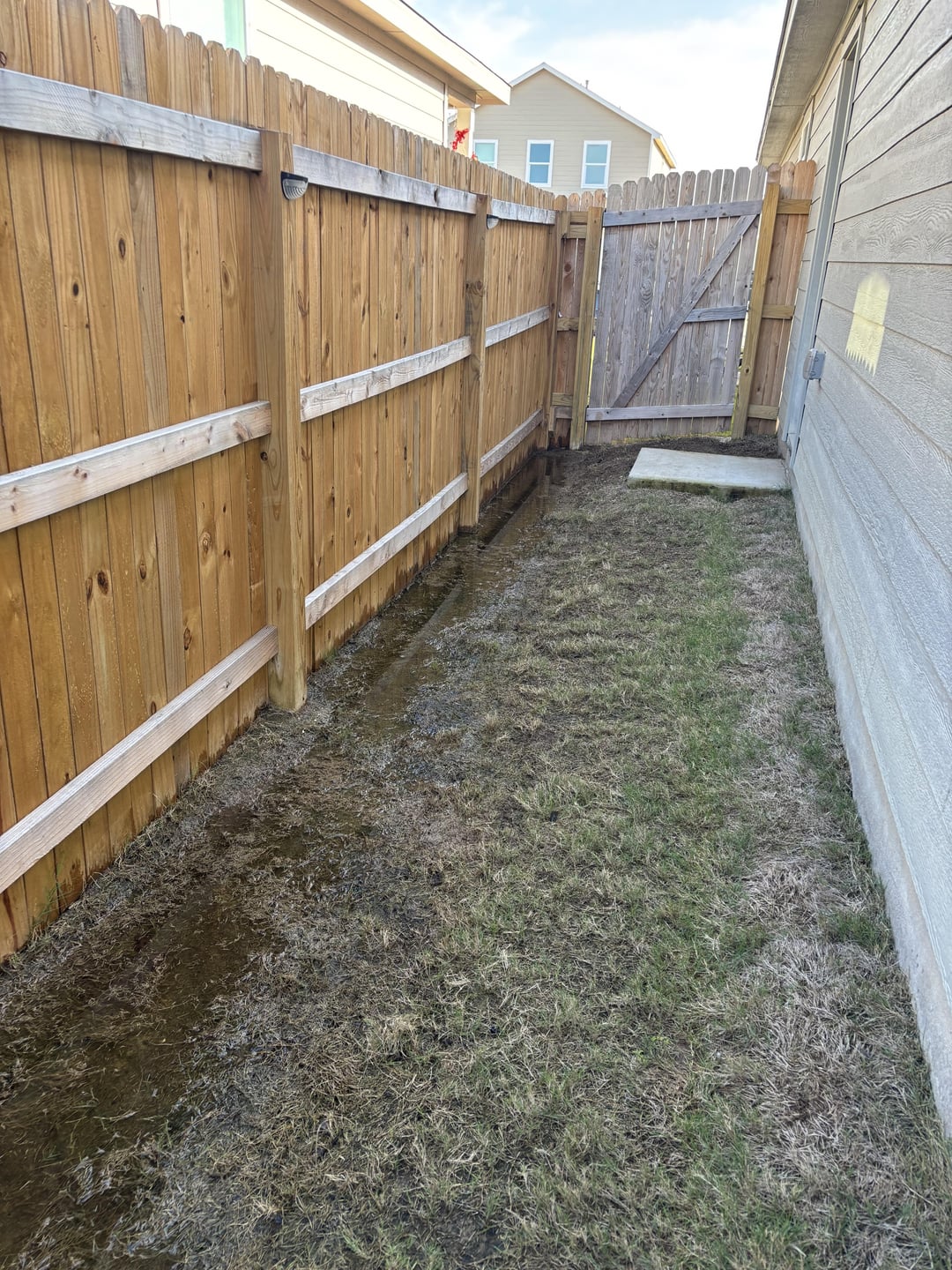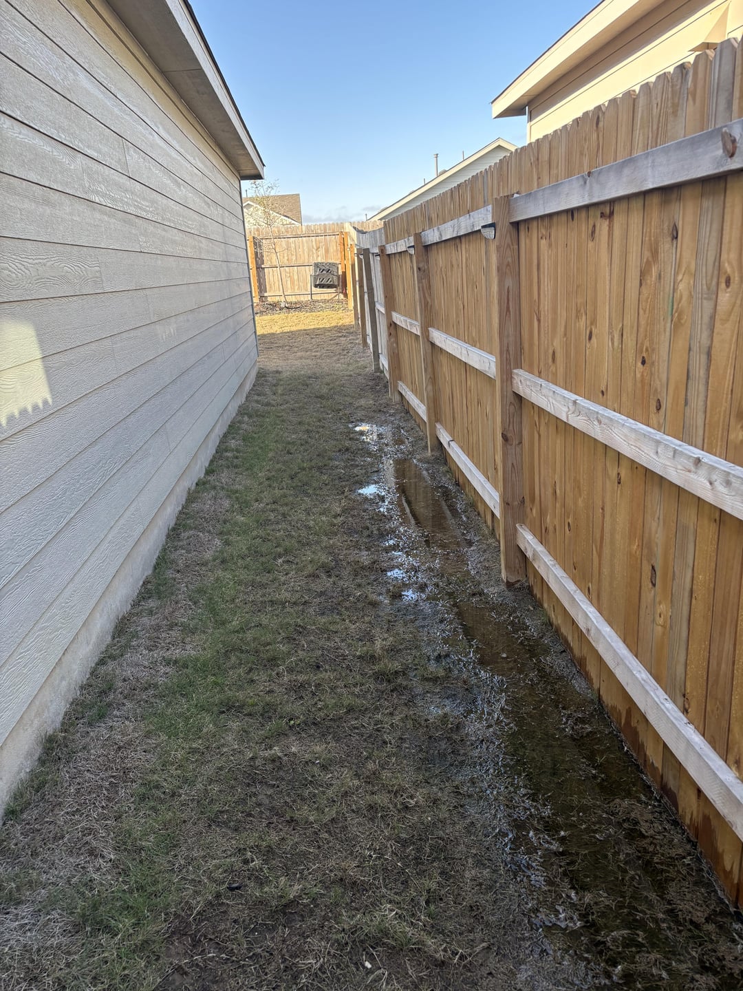 Thinking about a French drain. Not really sure. Eventually I was going to build a wall way along this path that goes to the actual back yard, but the run off from the house would fall directly on the dryer side where the ‘walkway’ would go