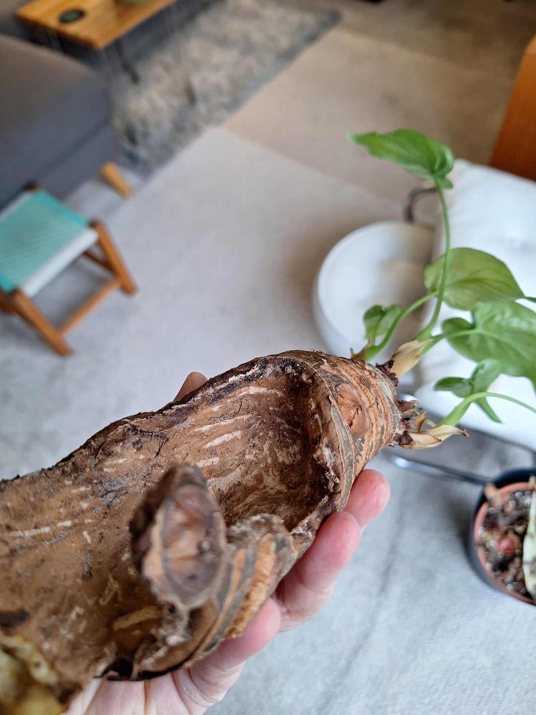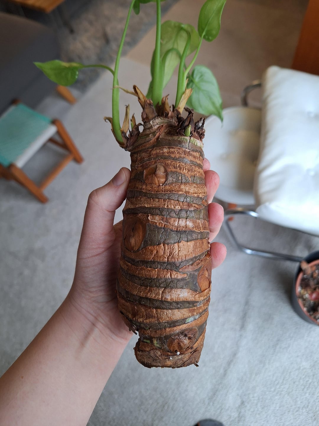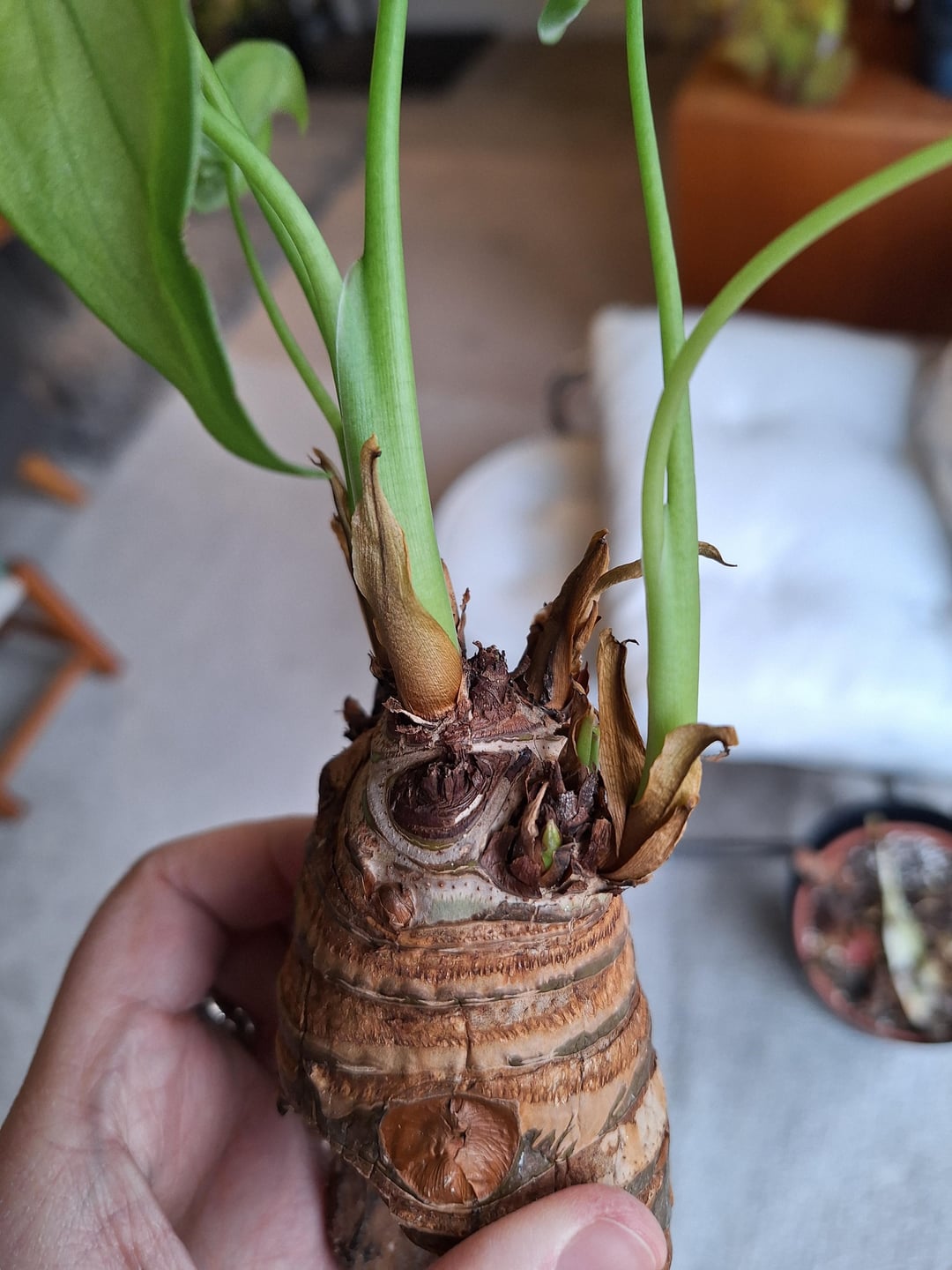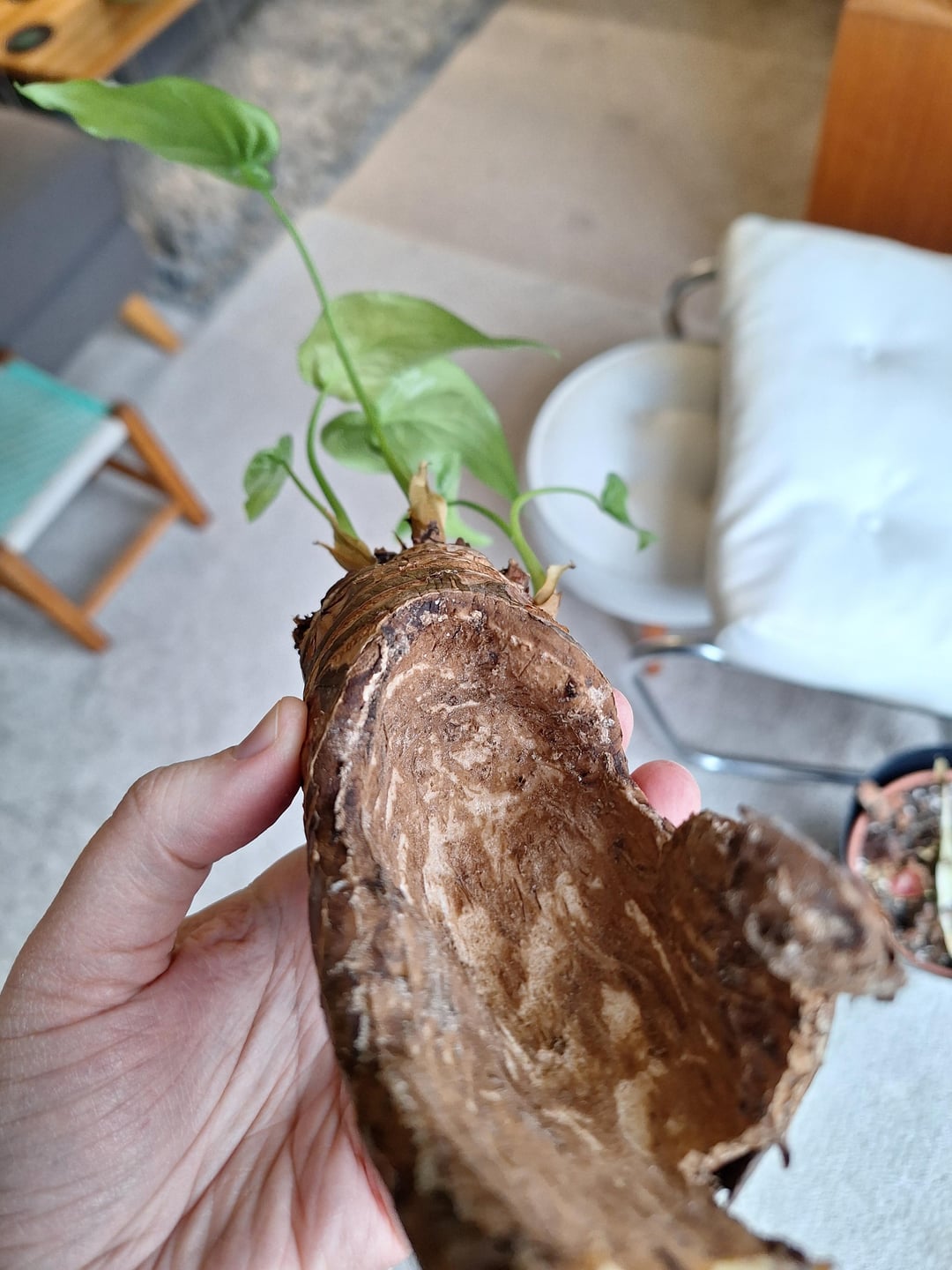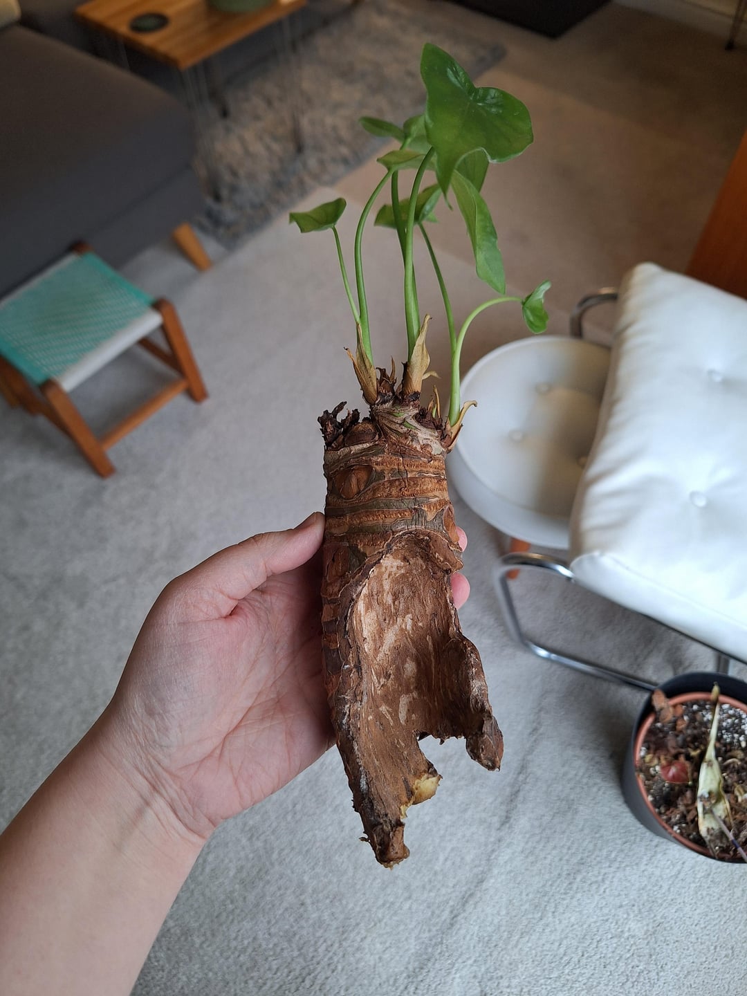 I know this looks so crazy 😅 but I rescued this alocasia corm/stem from rot. It has no roots, but is fully dry and calloused over and has lots of lateral buds and green growth. Tons of top growth too. What now?