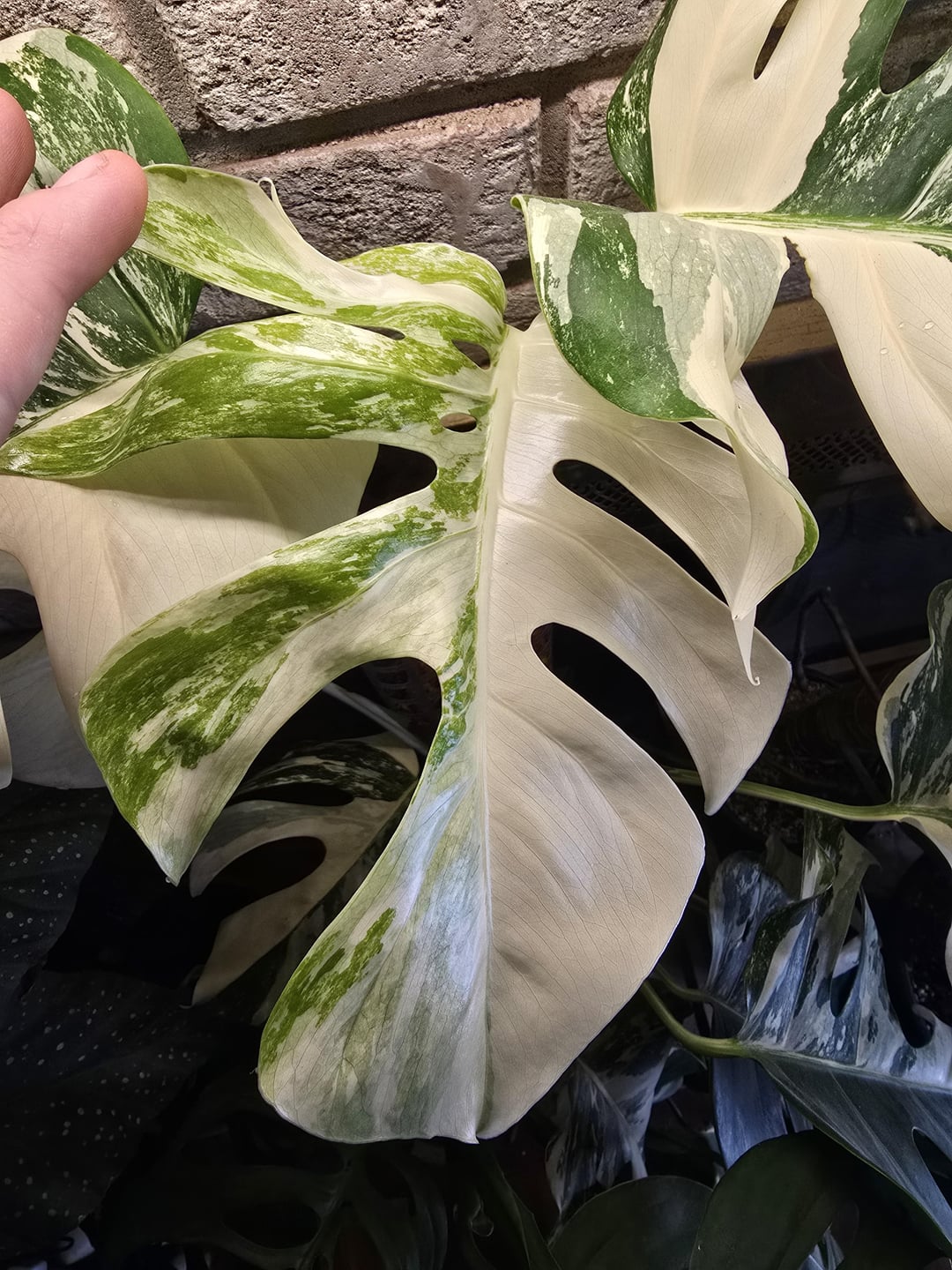 My wife picked up this albo back in the fall, and it has been growing a half moon every other leaf, highly variegated with no full moon leaves, and no reverting. She is mounted on a moss poss, and just gave us the first 2 inner fenestrations.