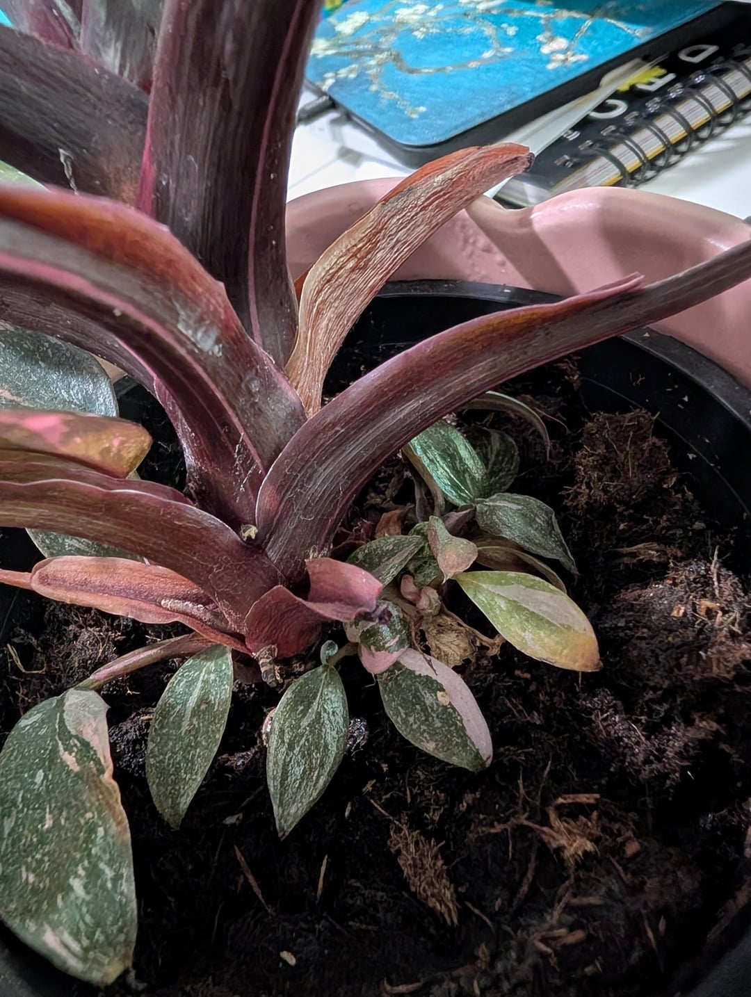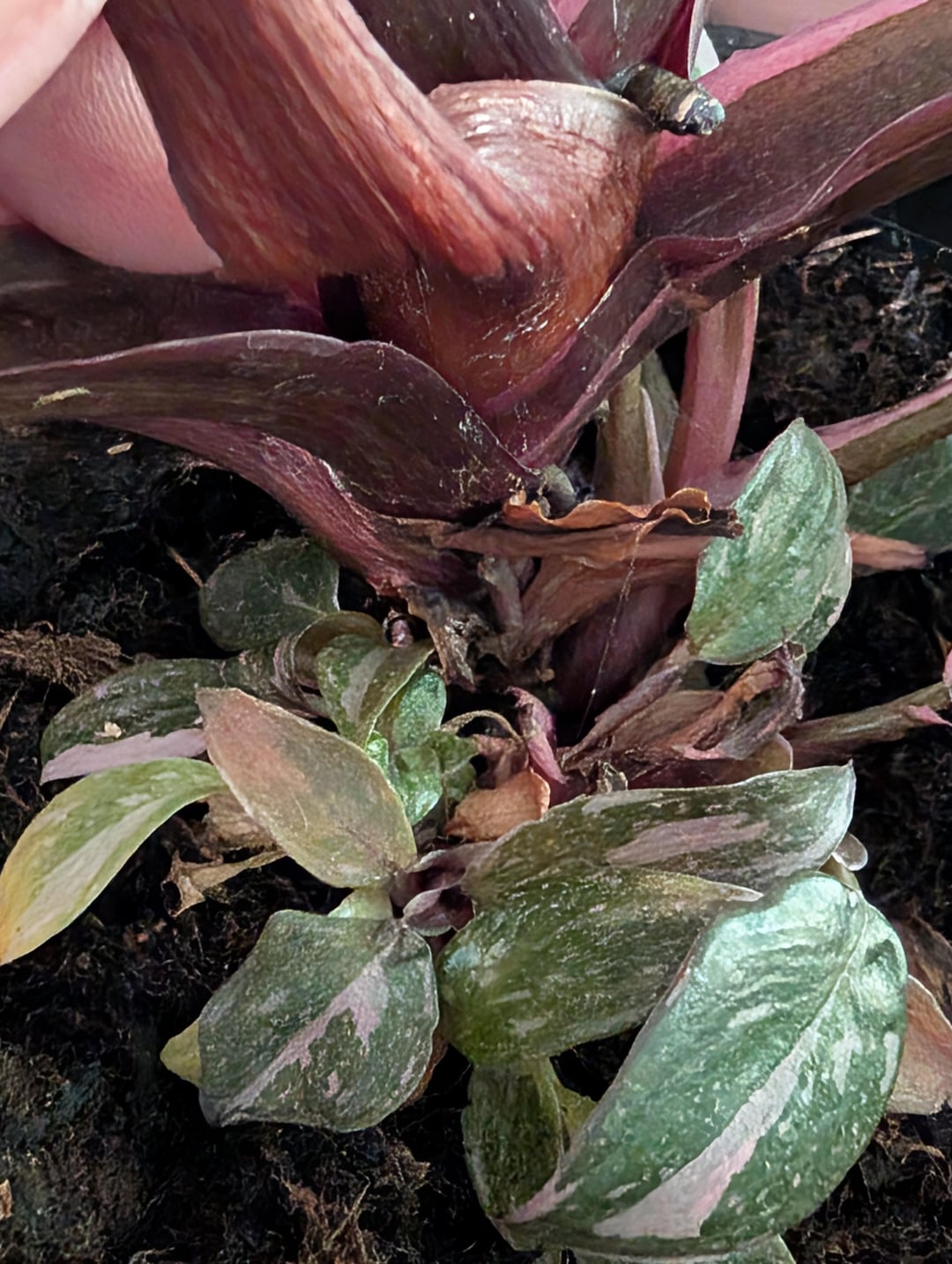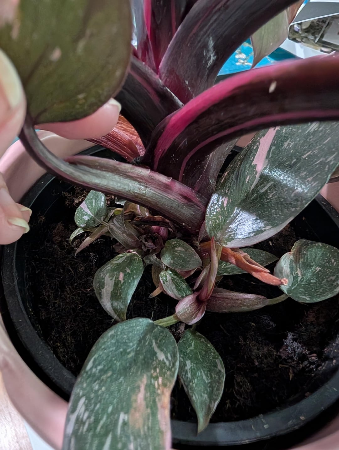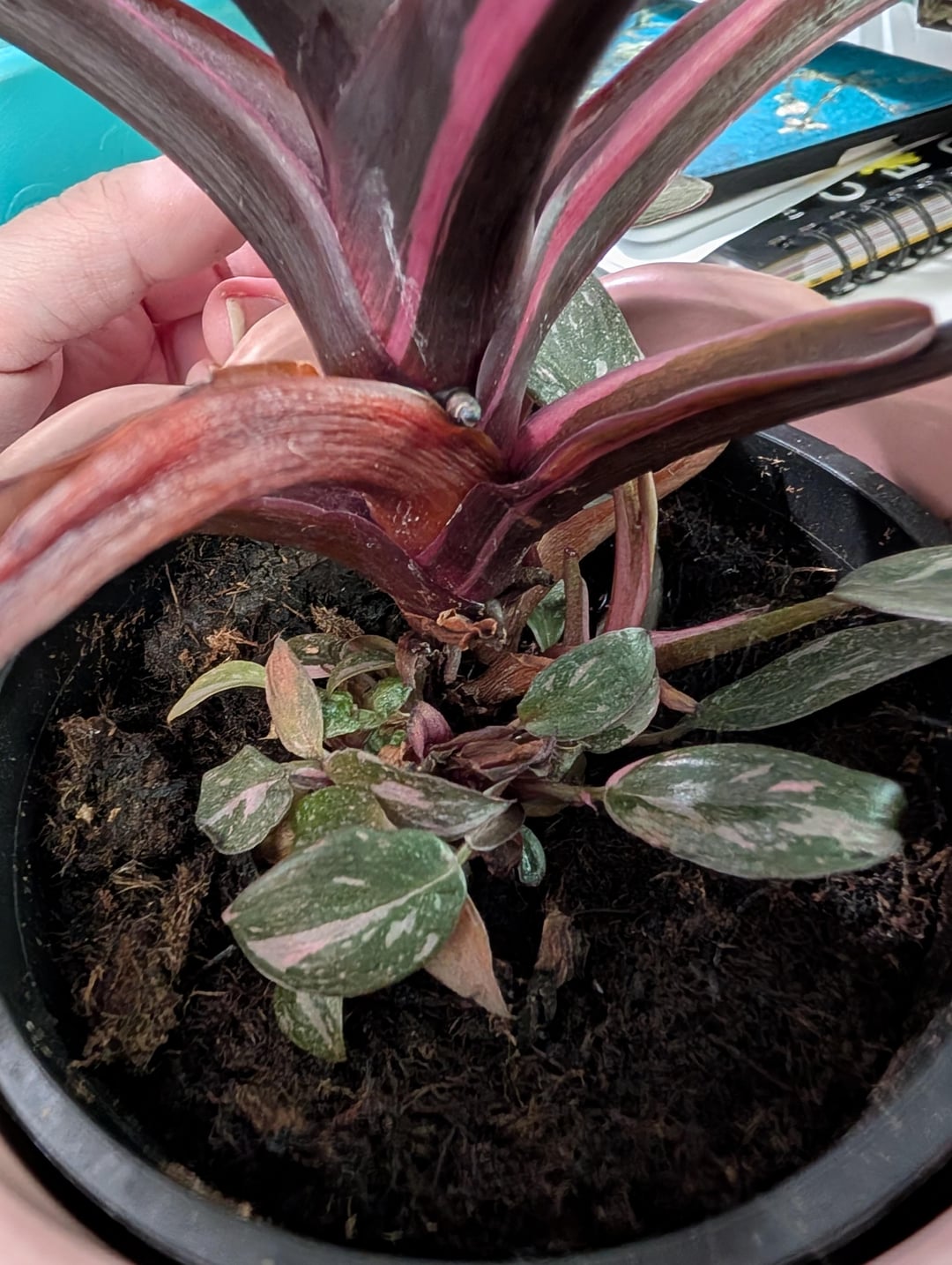 Hello! I recently bought this beautiful pink princess, she is my second. I need to repot her into a better soil mixture and pot, but she has all these teeny-tiny little leaves at the bottom/base of the plant and I am wondering if they are… separate plants? Do they need to be separated off from this main plant when I repot? What is the best way to go about this? I am nervous, I don't want to kill the plant. I did my best to try and get up close photos.