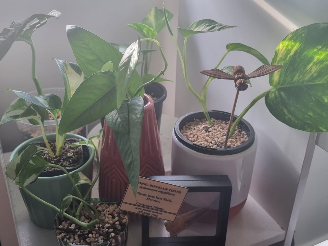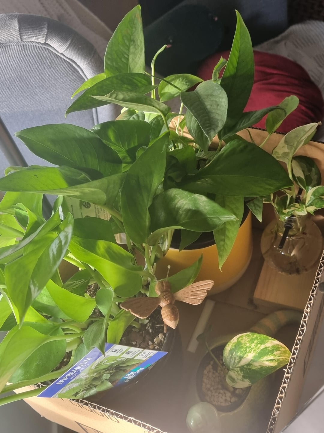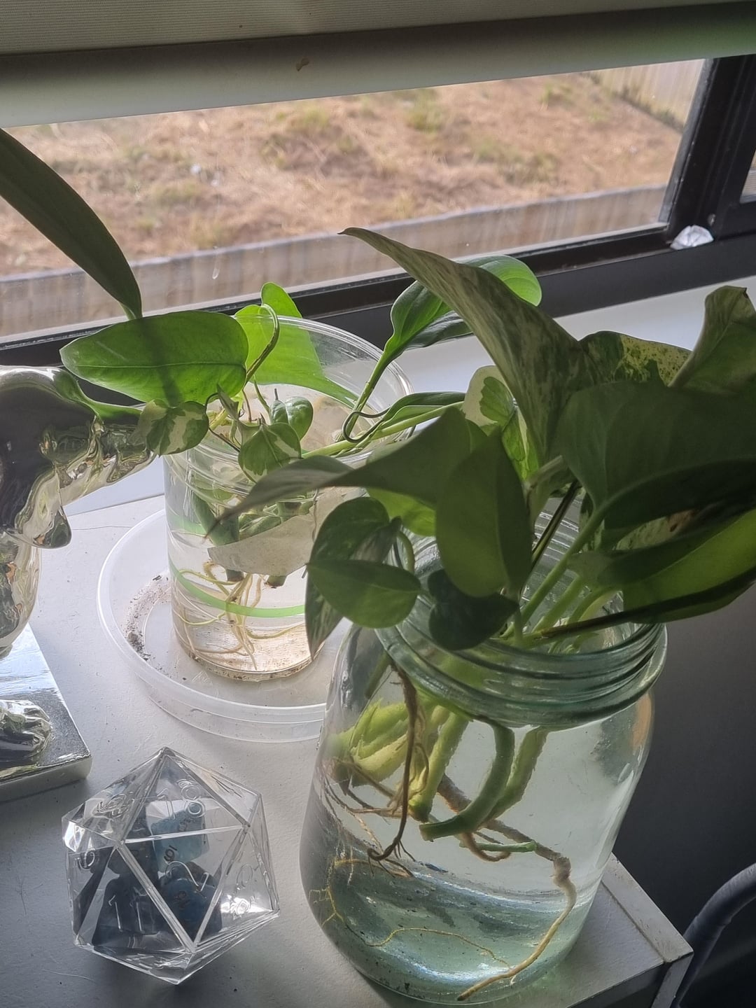 Either in water or in pots I now have golden, marble, neon, Cebu blue, silver streak, Njoy/glacier, jade, and manjula. There's also a Swiss cheese plant playing Impostor at the back there. Idk what he's doing, he has one leaf and a stumpy stem. He confuses and scares me.