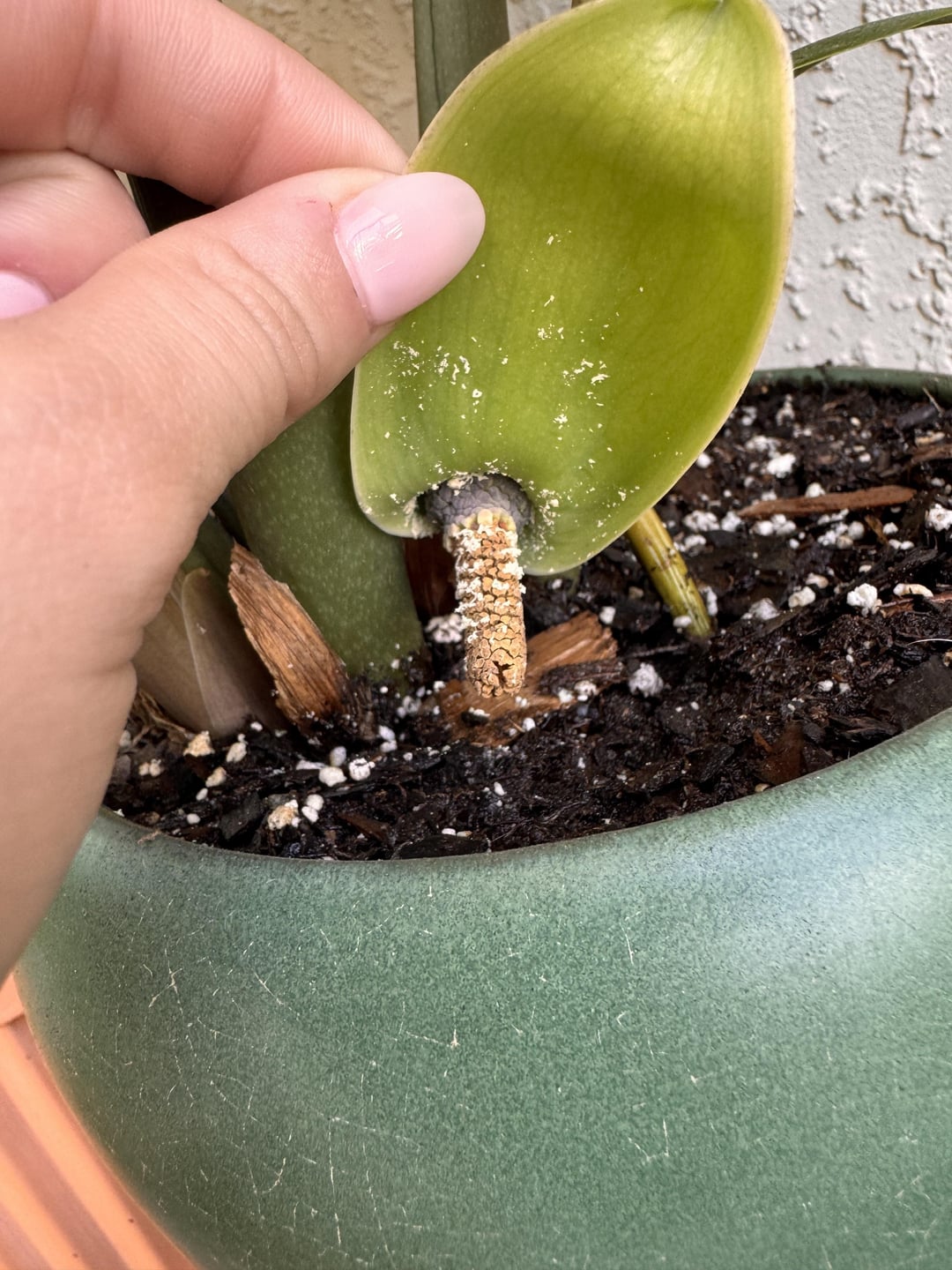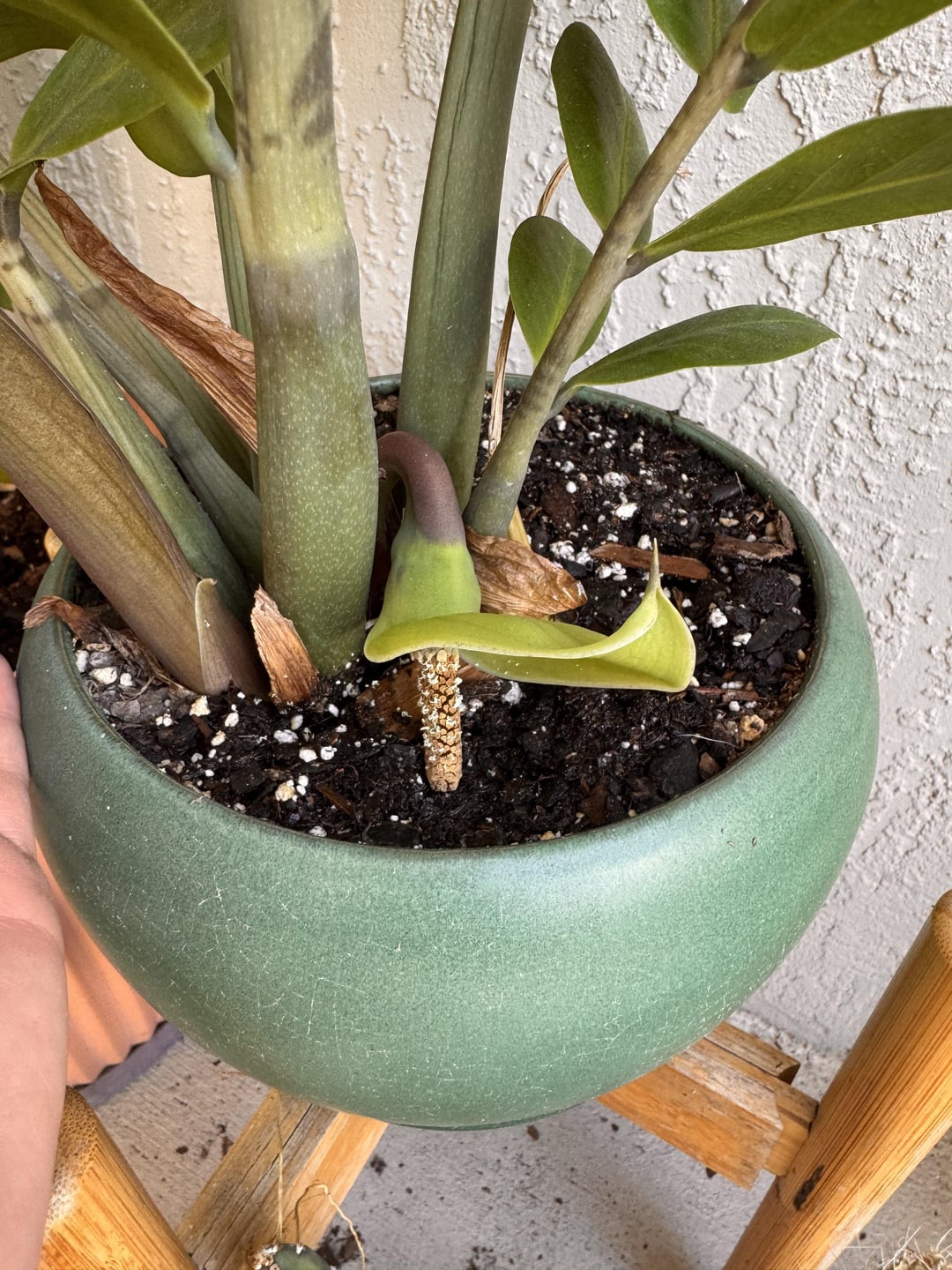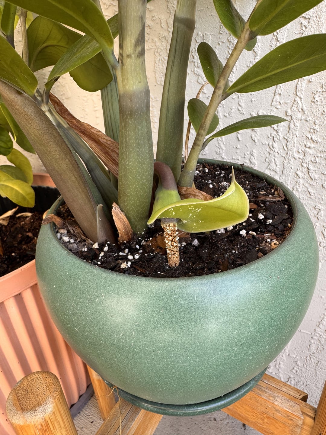 All plants in the aroid family share this very cool inflorescence (it’s actually made up of a bunch of tiny flowers) called a spadix. The specialized leaf protruding from the base of the spadix is called a spathe. Once you know what it looks like, it’s quite easy to recognize on all sorts of aroids (alocasias, anthuriums, philodendrons, monsteras, and many others all produce a spadix inflorescence). It’s an awesome family of plants and your ZZ looks great!