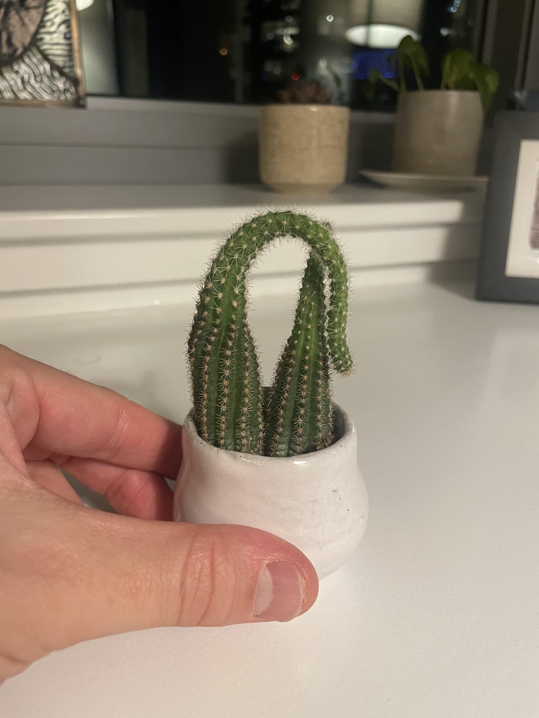 About three months ago, I moved into a new apartment with much more sunlight and since then, they’ve started sagging—the larger one is now somehow growing downwards. I only water them occasionally because they’ve seemed really healthy. They’re both still growing a little, but the larger cactus now looks extremely, almost comically, sad. What should I do?? I love these little guys. Should I repot them? Should I gulp cut the one that’s sagging so that it can’t start fresh? Help!