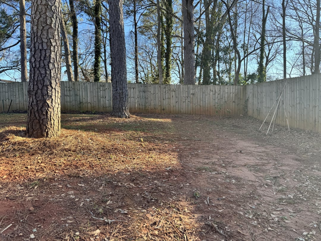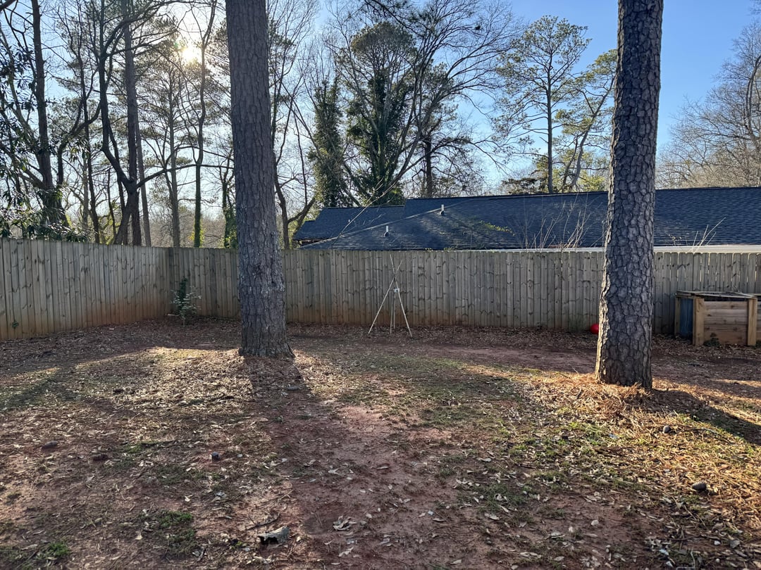 Our back yard currently has two pine trees in the middle of it and also has a small slope in the back.