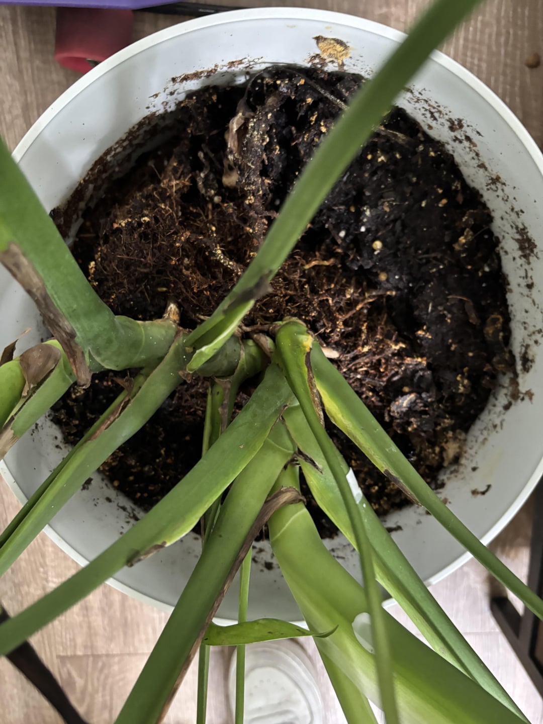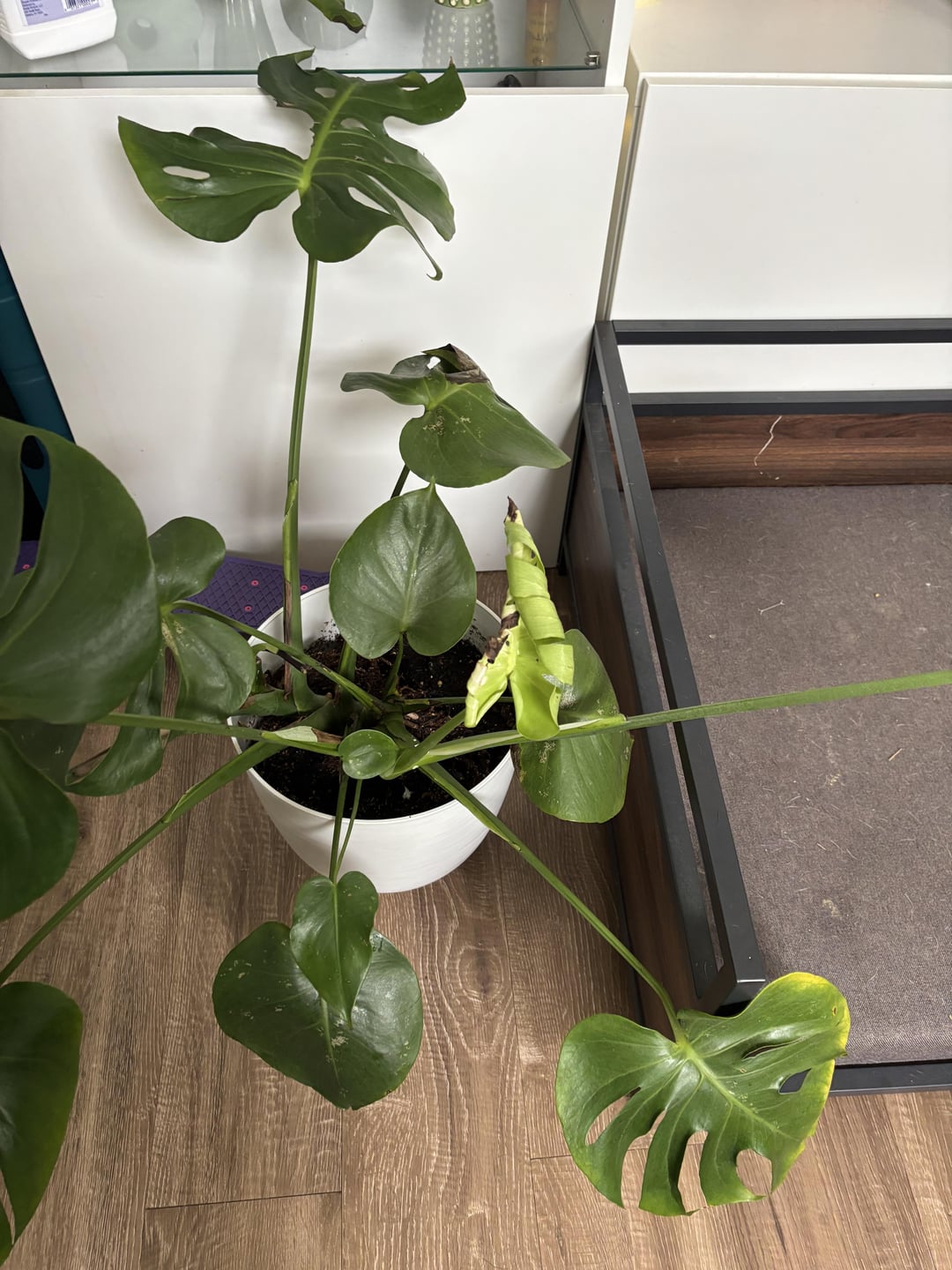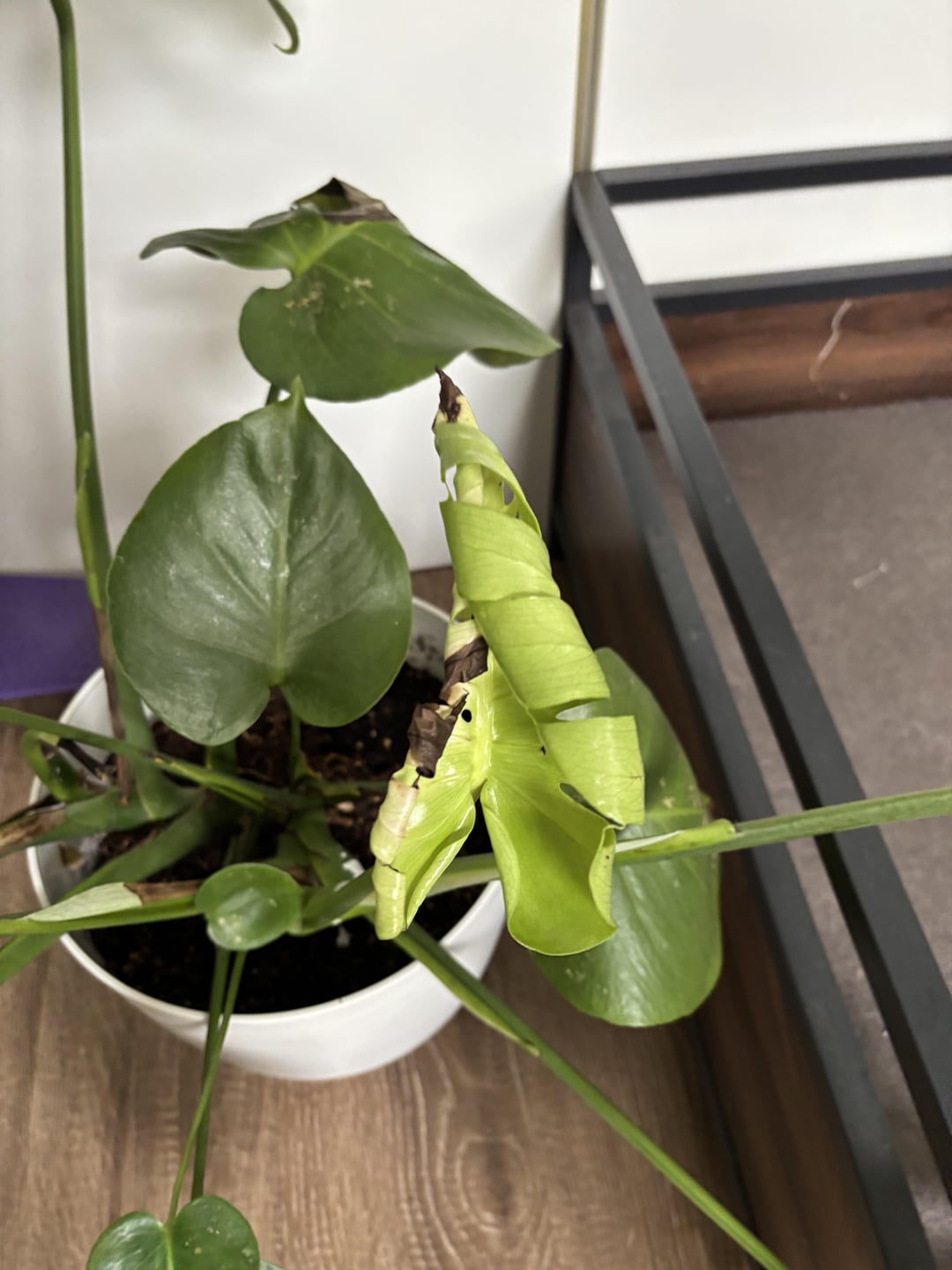 If this just started, it’s progressing really fast because the damage is quite extensive. You are definitely overwatering the plant and that’s what’s causing brown leaves. Water only when the soil is dry about 2- 2.5 inches on the top. Besides overwatering, it seems the plant is infested with (most likely) thrips which is causing droopy leaves and those light spots that you see on the plant. There’s multiple ways how to get rid of them so I suggest you to watch couple of You Tube videos to see which method you consider best. And I’m not sure if the pot has drainage holes at the bottom which is very important because the roots of the plant are going to rot. If you don’t want to repot then I’d suggest you to drill the holes on the bottom.