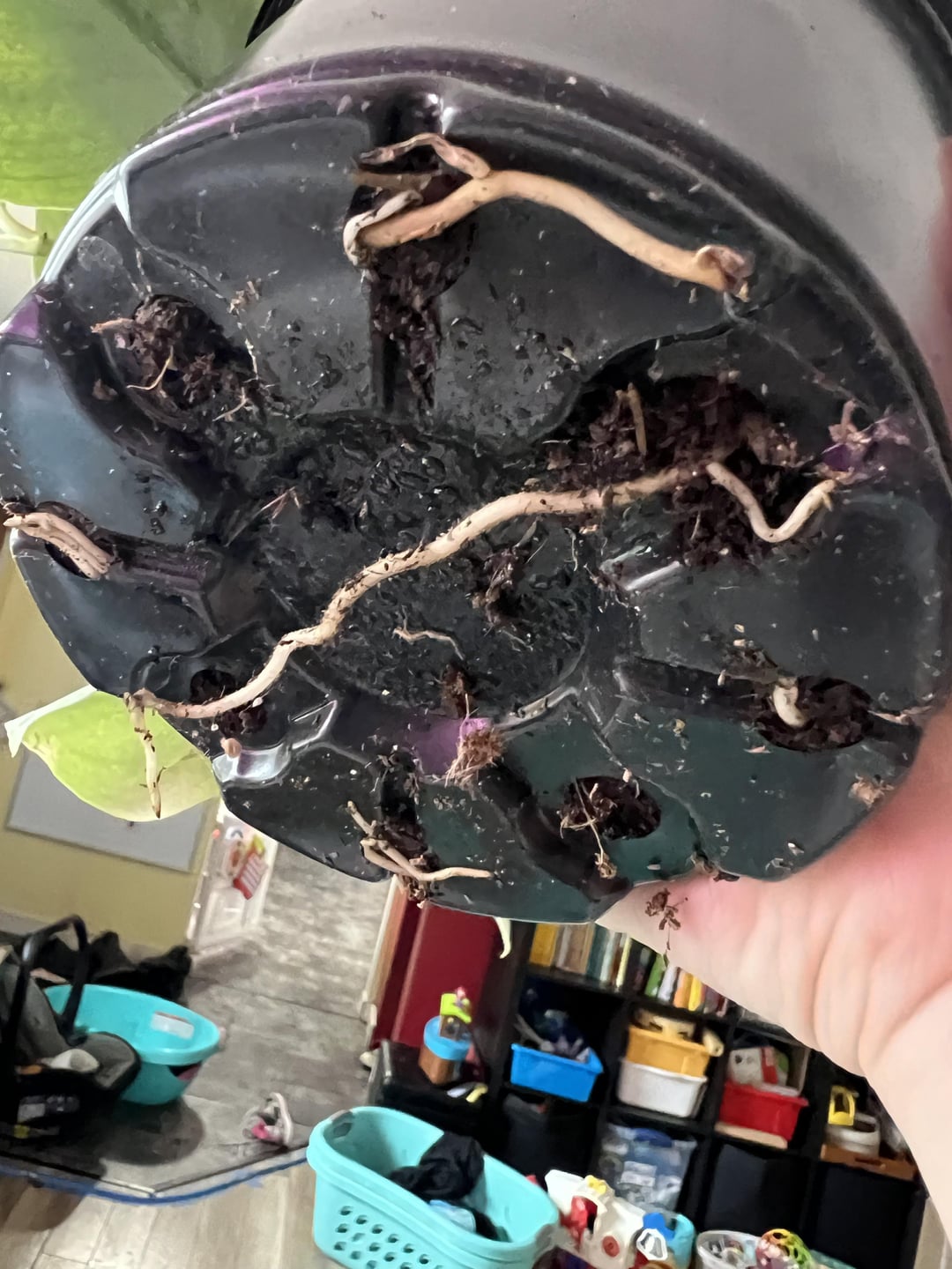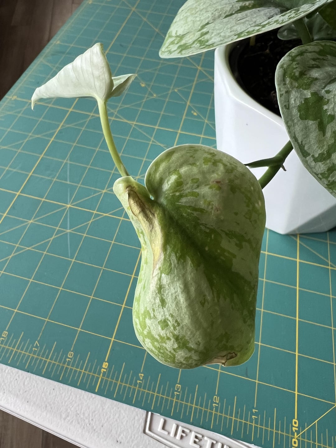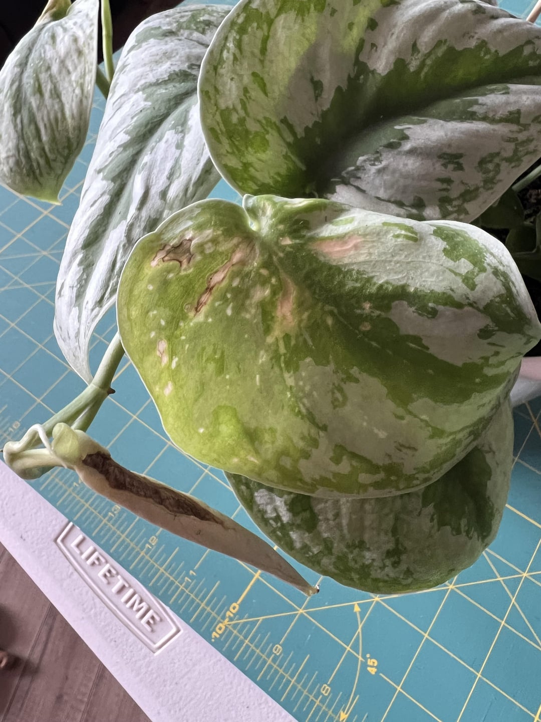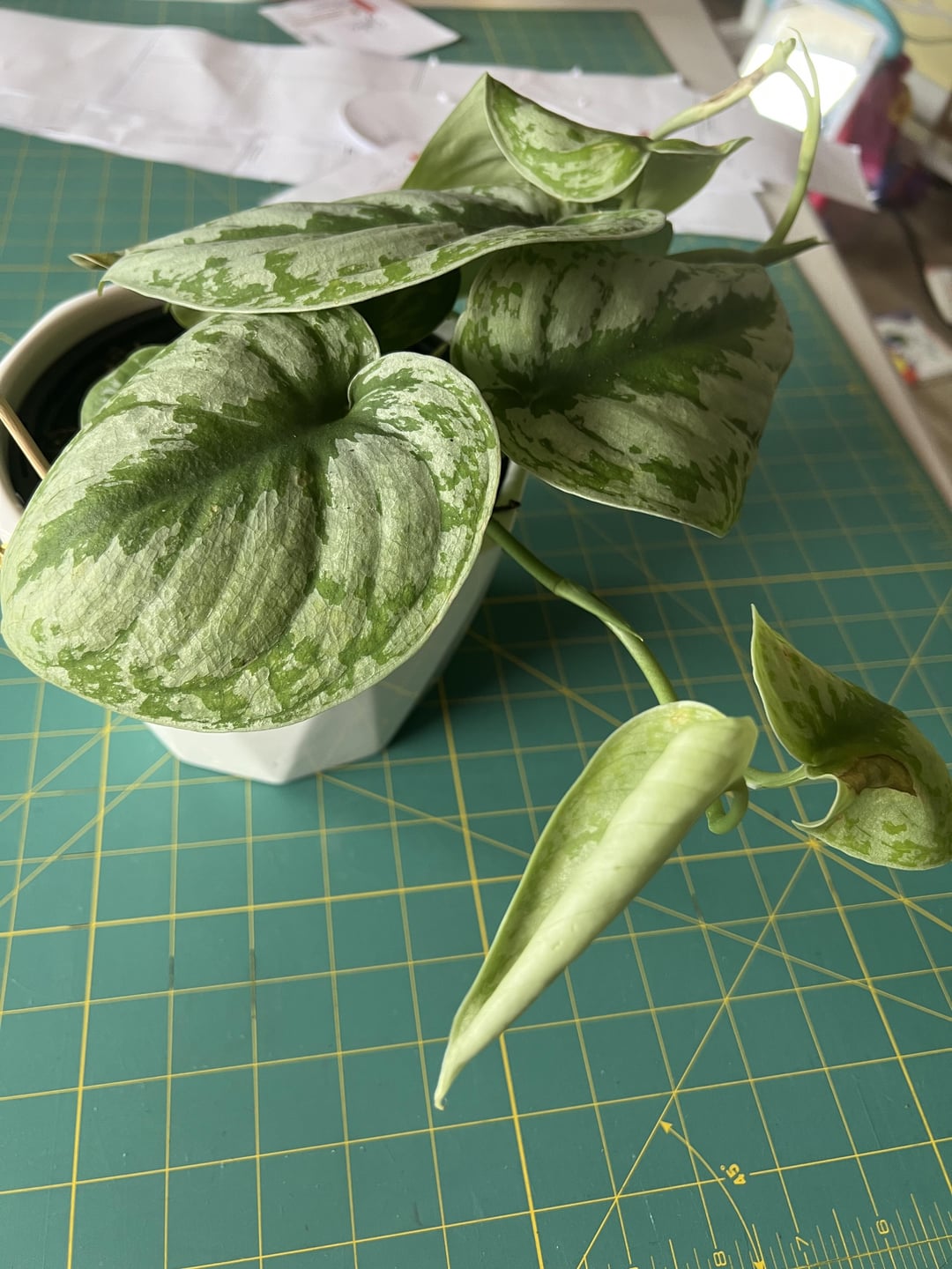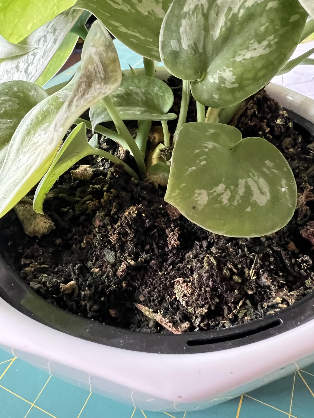 Husband bought me this Satin Pothos for Valentine’s Day. I know it’s technically not a Pothos from researching. It has some yellowing and brown spots. As well roots are growing out the bottom. Attaching some photos, hopefully can get some ideas on what to do for it. This is how it came, haven’t done anything for it yet.