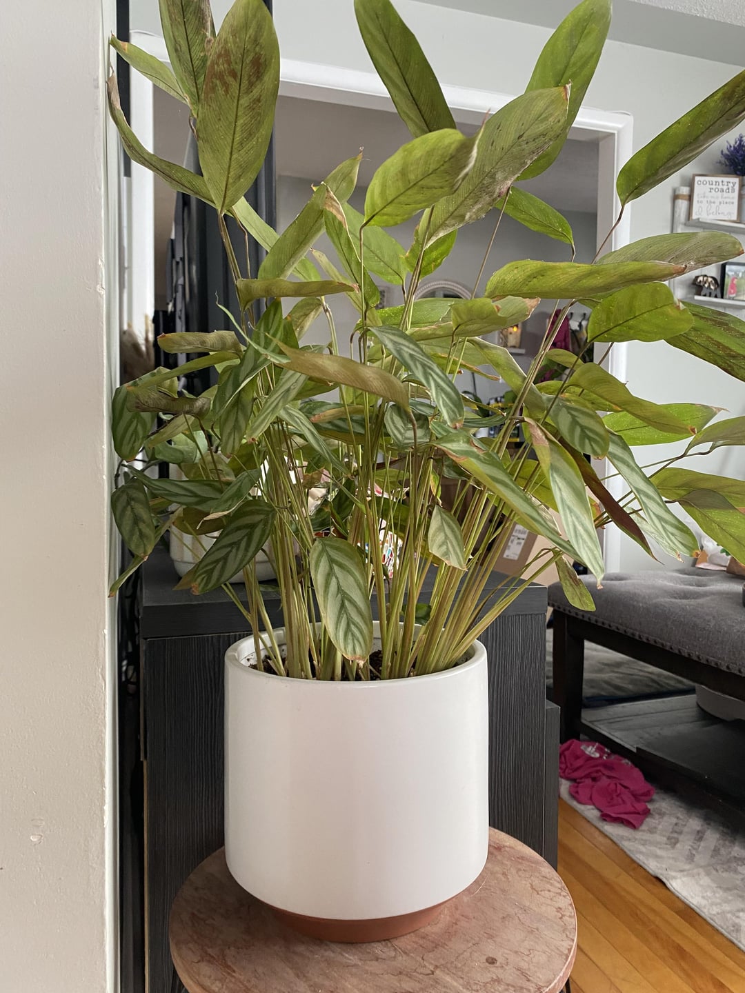 My prayer plant has lost all its purple on the underside of its leaves, and the tips are turning brown, and the leaves curl in often. Which makes me think it needs to be watered, but the soil feels damp. It’s in a spot with indirect lighting about 10 ff from a south facing window. Help!