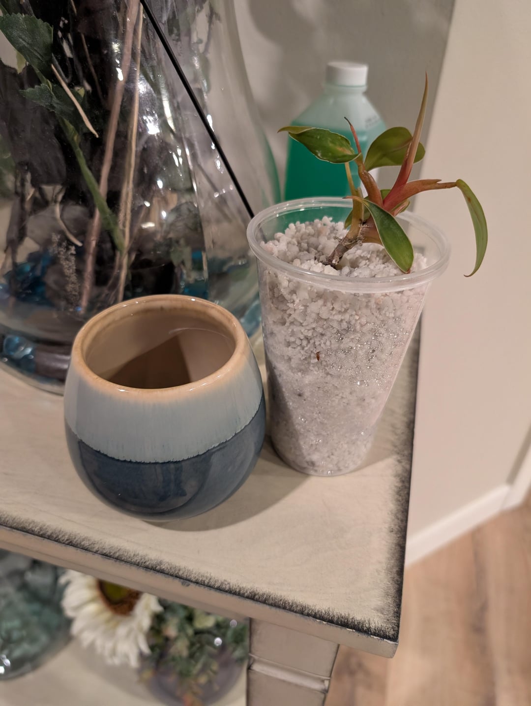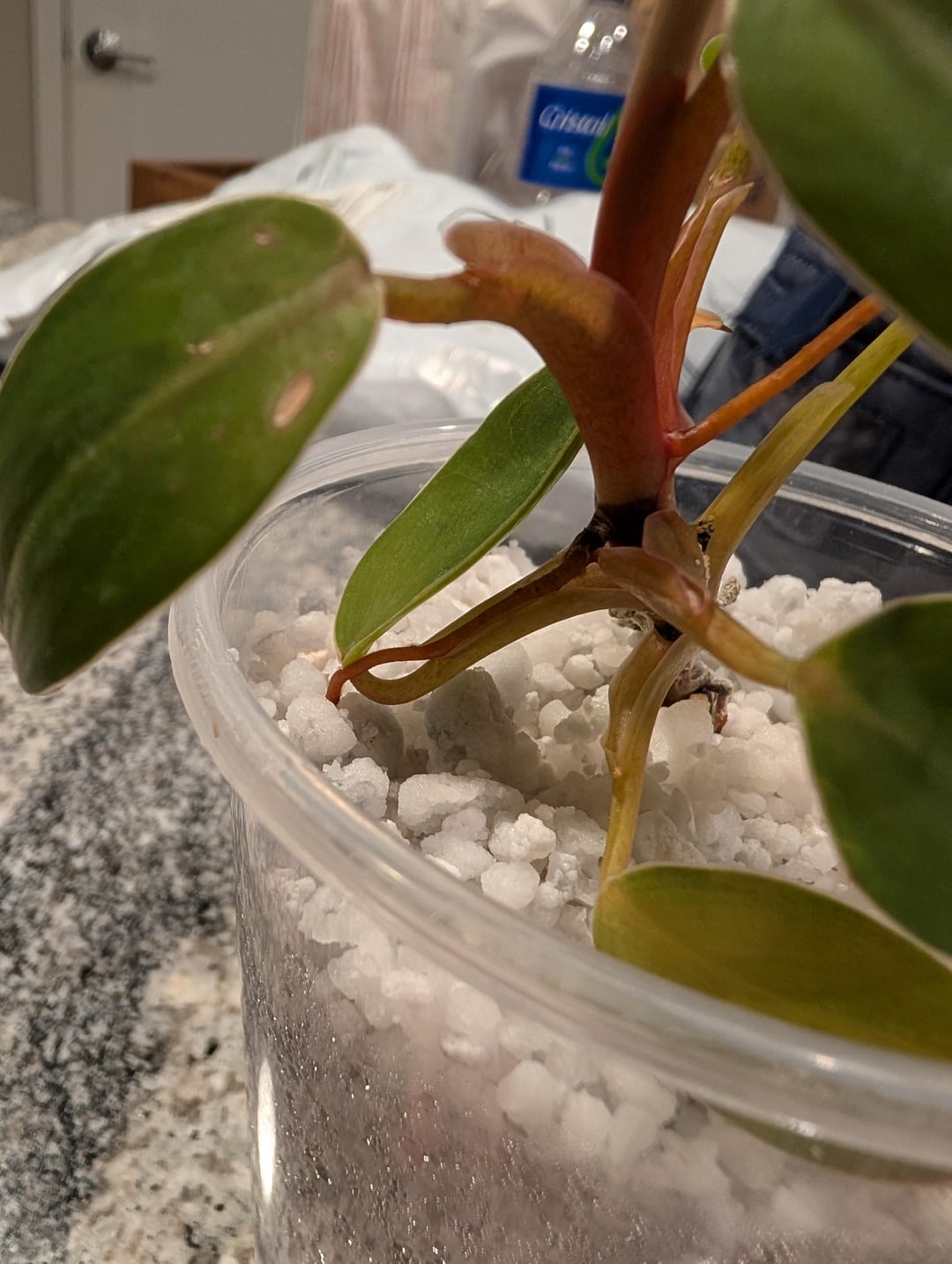 Since Thanksgiving, I've been propagating this red emerald(?) cutting that I accidentally lopped off my Grandma's 30+ year old philo, and he's finally really sprouting some roots and even two aerials. I'm hesitant to pull him out to check for secondary roots, and I'm also unsure of what size pot to put him in. Is this 3x3ish pot too small? And do you guys think he's ready to move to another pot in general?