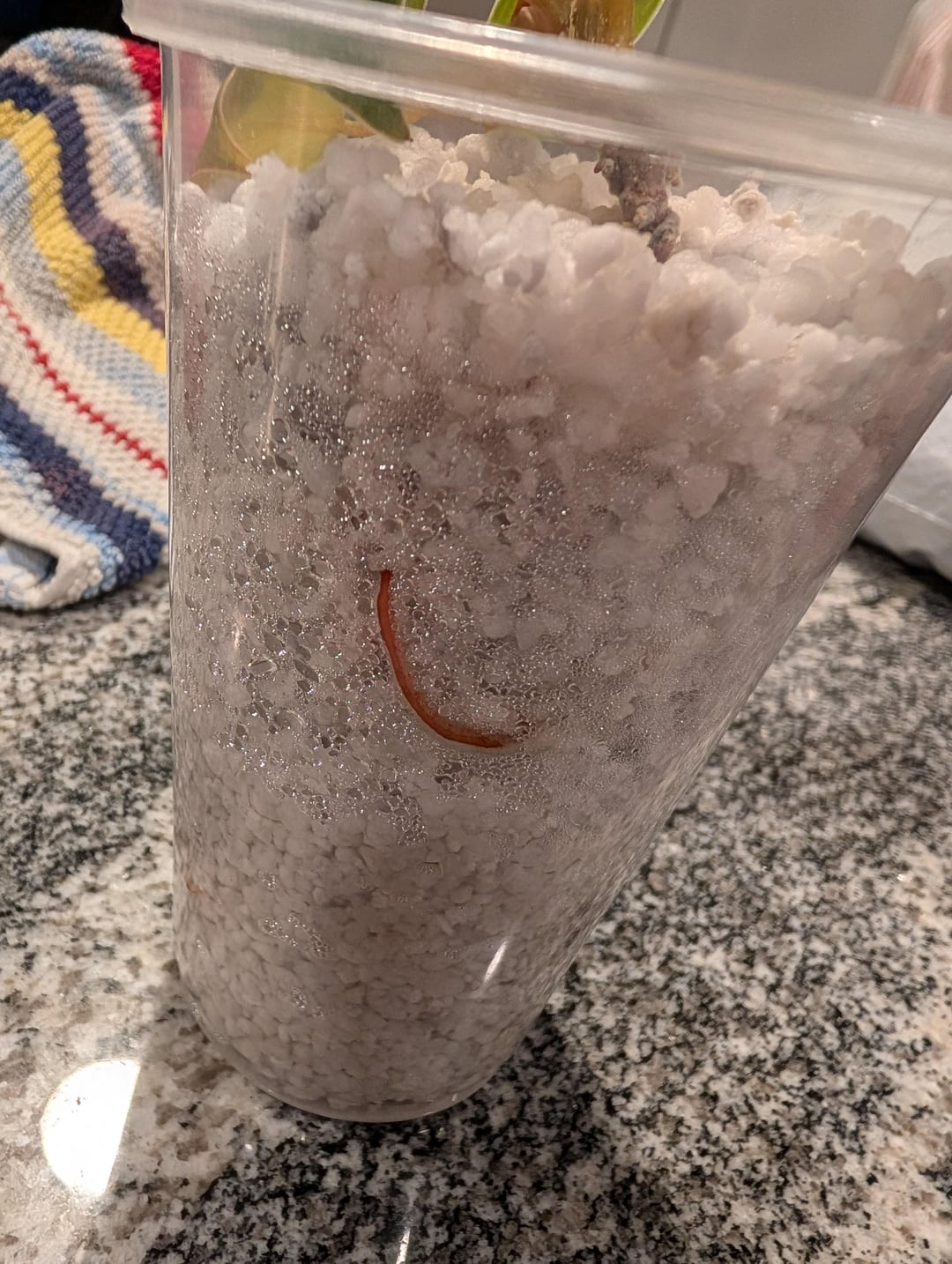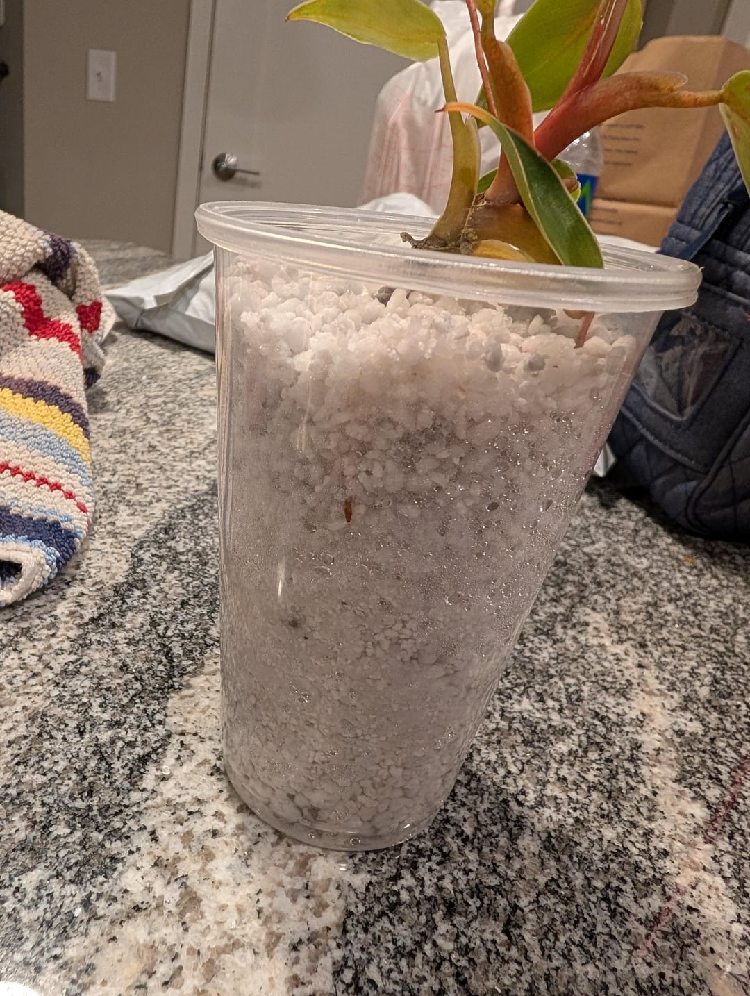 You should keep it in the perlite longer until you see the roots through the cup.