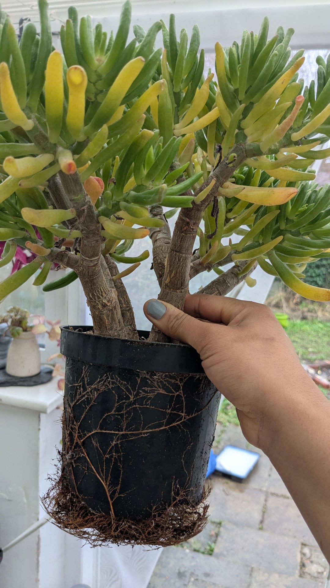 Looks like crassula ovata gollum. I wouldn’t worry about losing some of the roots, succulents are usually pretty hardy at growing them back. Just don’t water it for a couple of days after you pot it up again, that gives the root damage time to callous over.