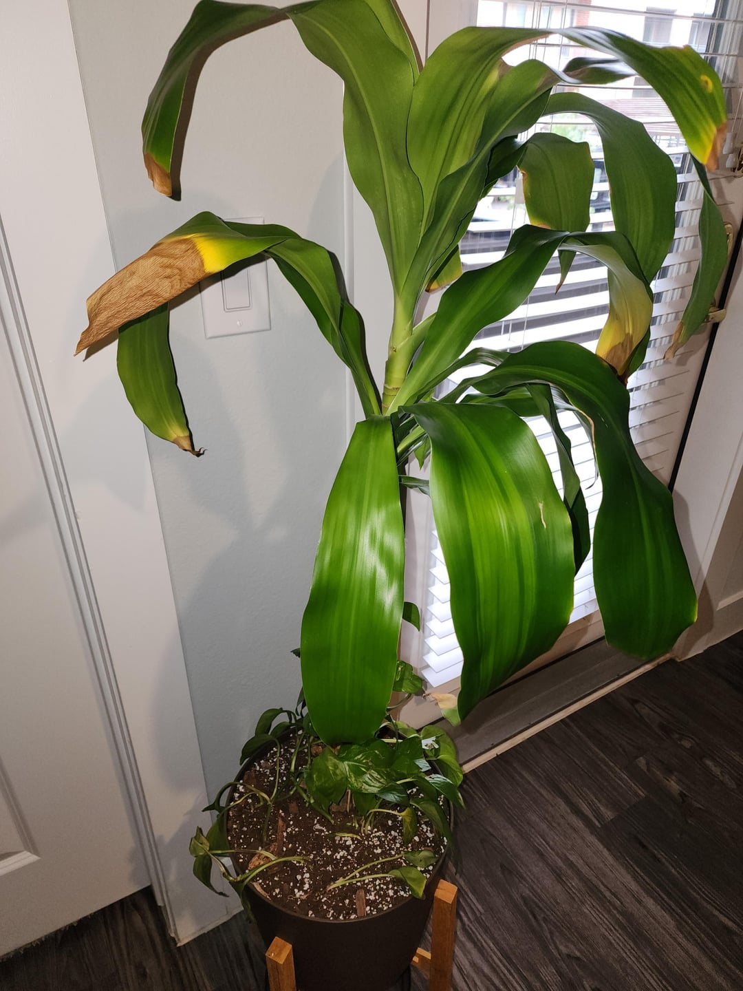 How long are these potos on the same pot? They tend to grow quite big roots. They also require a complete different water schedule. Could they be competing for nutrient with the Dracaena? I managed to control mine basically by treating her as a Succulent more than as a normal plant. Even with succulent soil. In such situations the potos won’t survive.