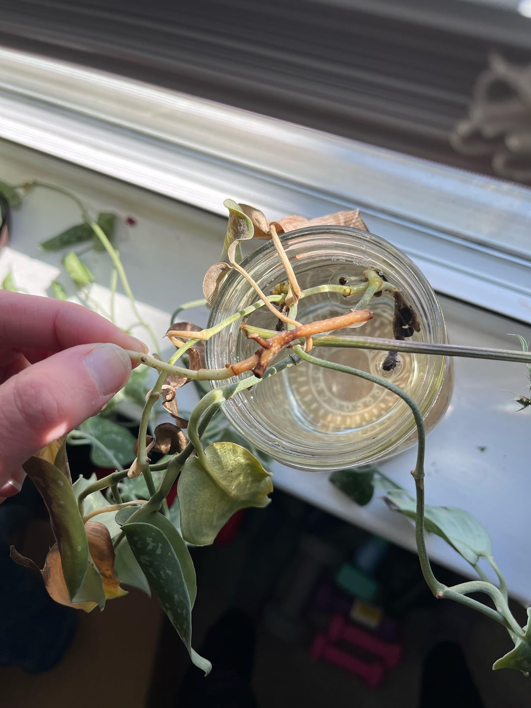 I’d throw a little hydrogen peroxide in the water occasionally. Keeps rot from happening. I also would trim the lower leaves on the vine so that they aren’t submerged in the water.