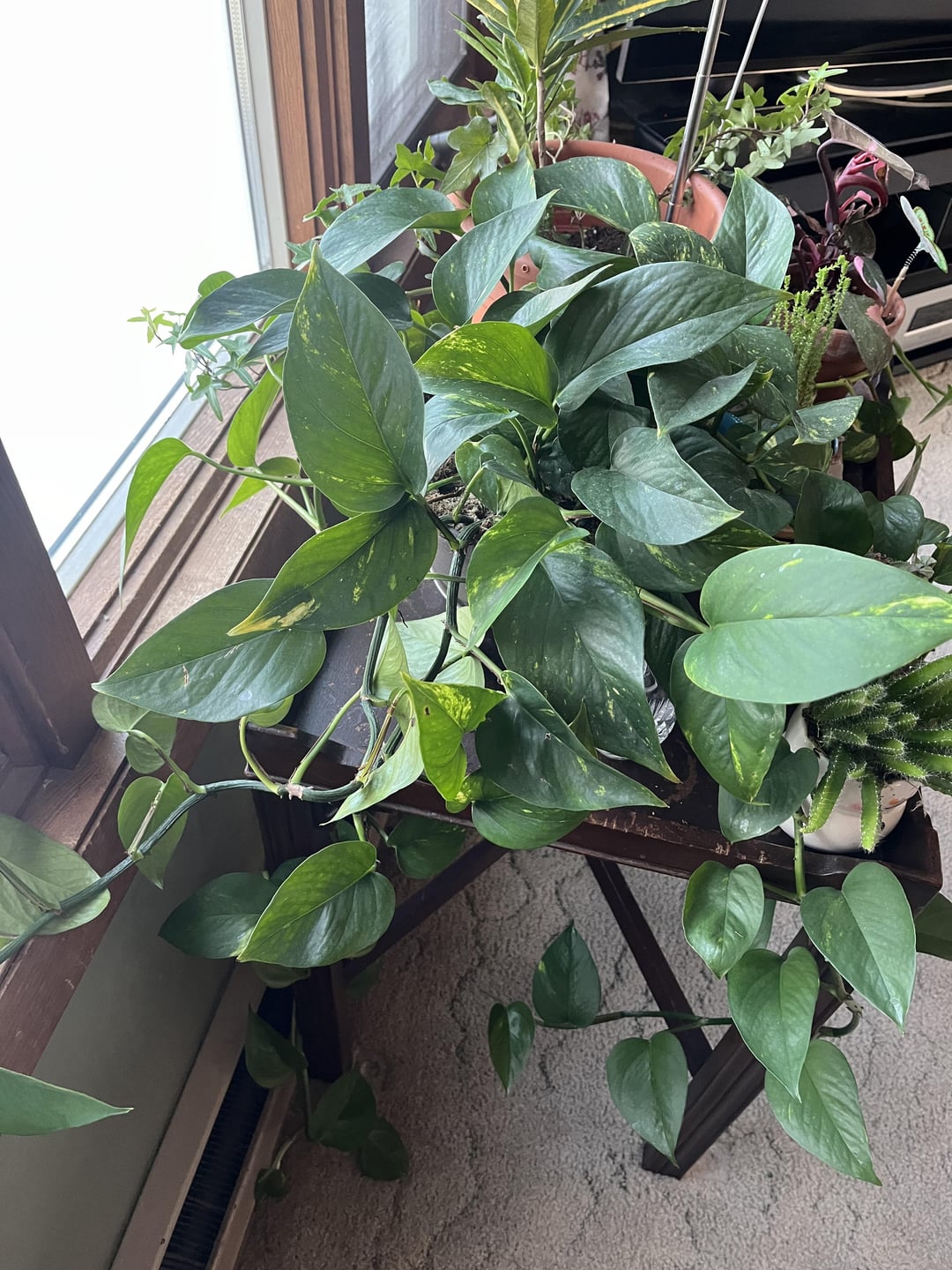 Y’know, now that you mention it, I’ve been growing pothos for 25+ yrs and I’ve never repotted one, either. I’m always taking cuttings and starting new pots, or completely cutting it back to the soil when it gets bald, but I honestly can’t recall repotting one, ever. All of mine came as cuttings from friends or family so never had to deal with sh*tty store soil for one of these guys. I’m rambling and of no genuine help, but I do love the sparse and light variegation of this one!