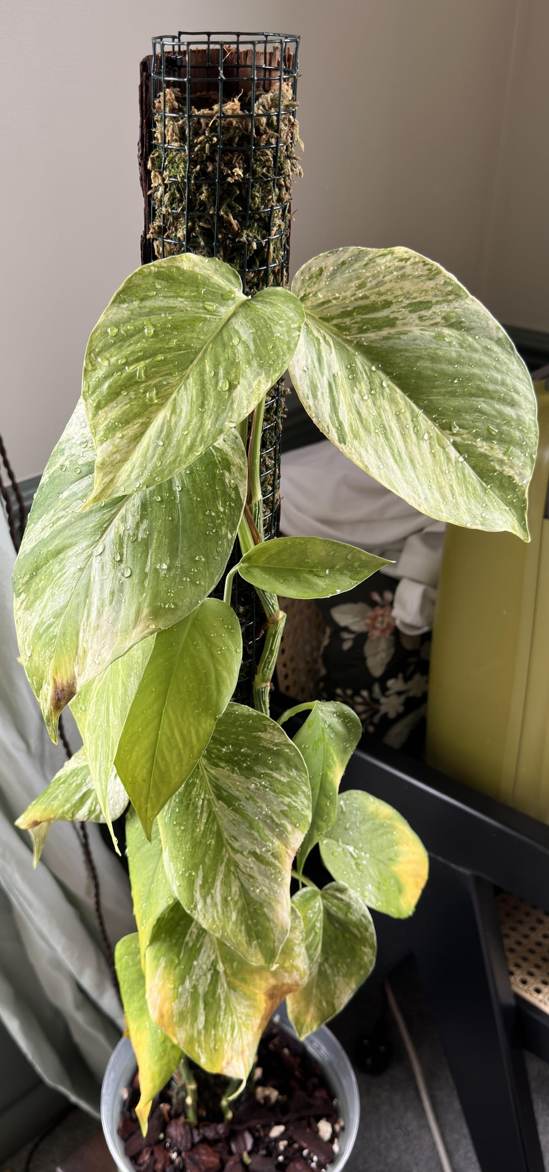 Just an FYI, I use automatic irrigation drippers on my moss poles and it’s fantastic for keeping them evenly moist. Once you have it set up, the only maintenance is replacing the water jug every few weeks when it runs out, but you can change the setting for water frequency & amount, etc. I’ve found it especially helpful for the poles that are 2-3 feet taller than me, no more step ladder every other day to water the pole