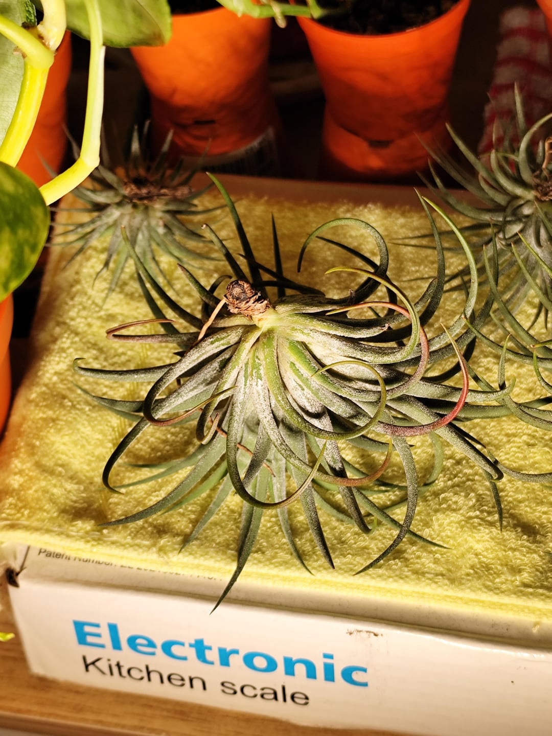 Have them since June 14, 2024. Soaked them every 3 days for 2 hours with filtered water (I hate seeing them with dry tips) with fully submerge. And soaked them in diluted bromeliad fertizer once month with 4 hours fully submerge. After done soaking, always let them sit uoside down on a piece of cotton napkin for 24 hours, the plants took about 1.5 to 2 hours to fully dry up as I used fan to help them dried up faster.