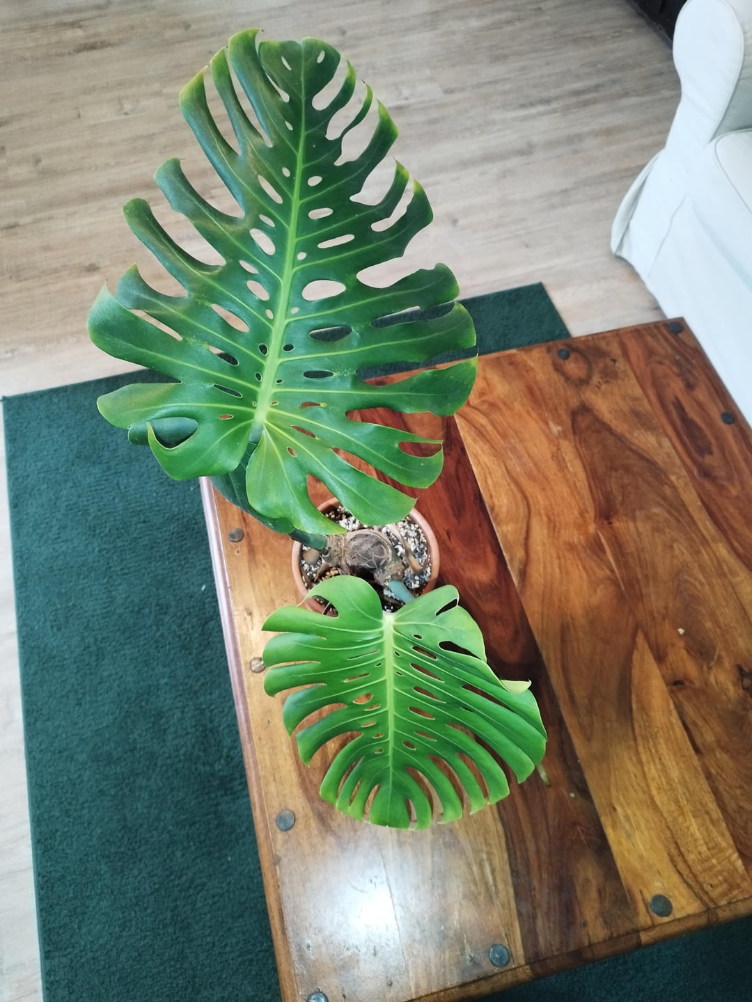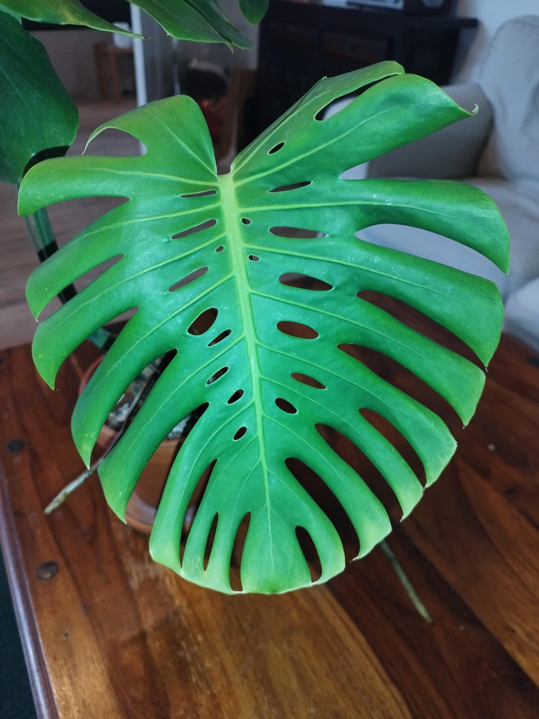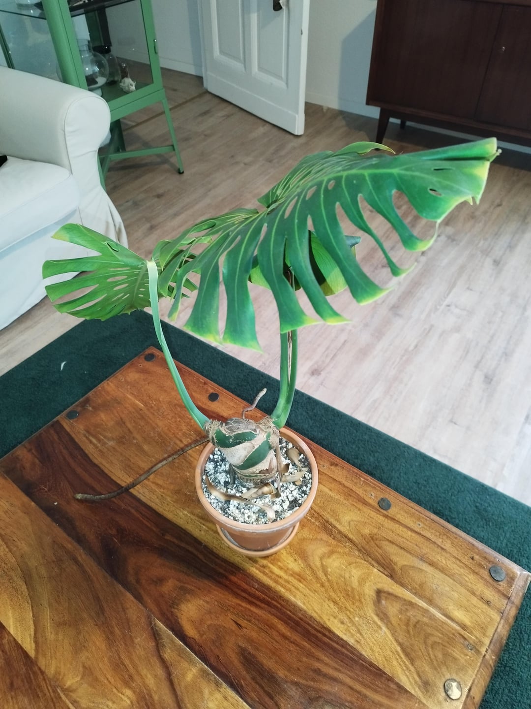 I need some advice on my Monstera deliciosa. I brought this cutting back from La Palma last year, rooted it successfully, and then planted it. It seemed happy at first and grew two large, beautifully fenestrated leaves from two different shoots.