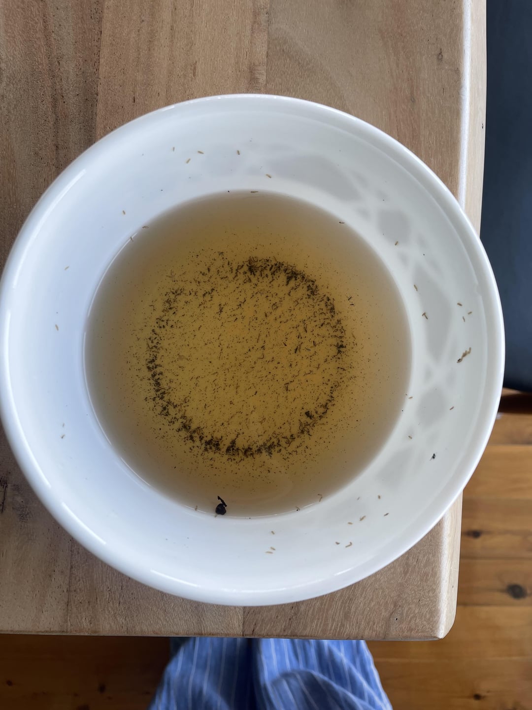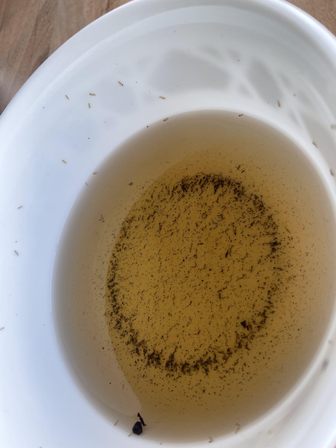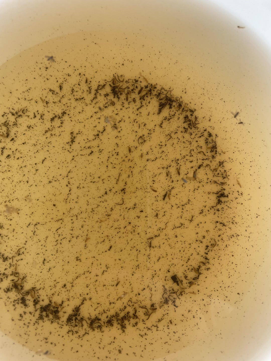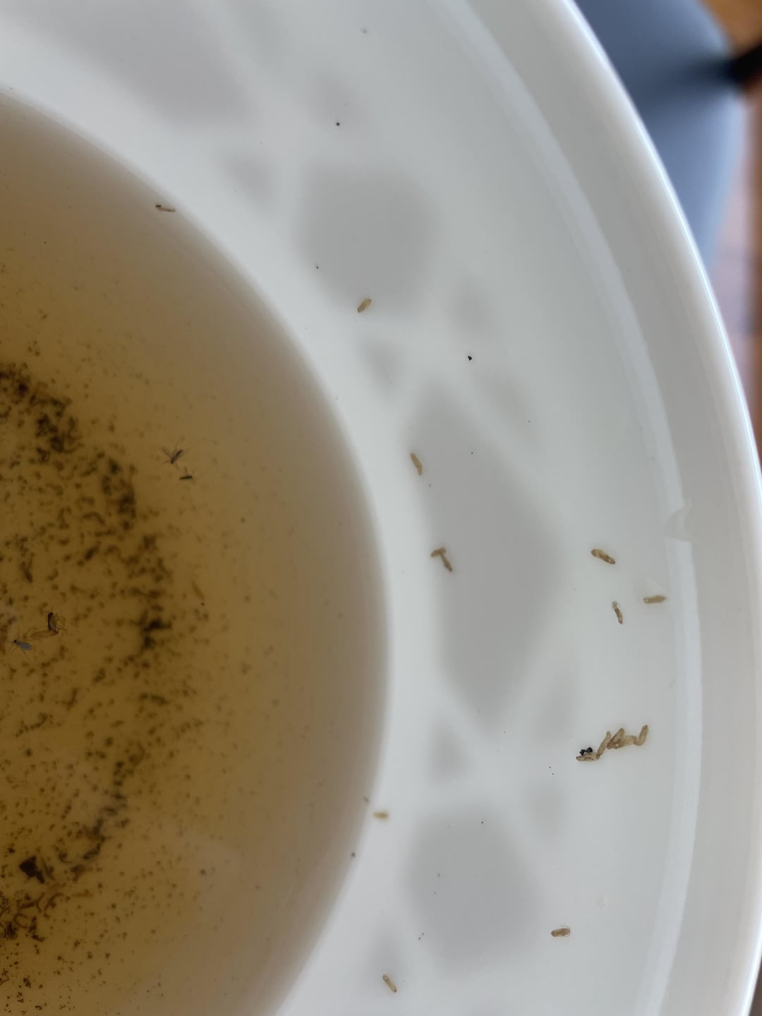 I bottom watered my calathea for the first time ever and this was the waters end result, The plant itself hasn’t really bounced back after I trimmed her after having a rough first winter, and she definitely has a little fungus gnat problem, but was wondering what these little maggot like looking things are?