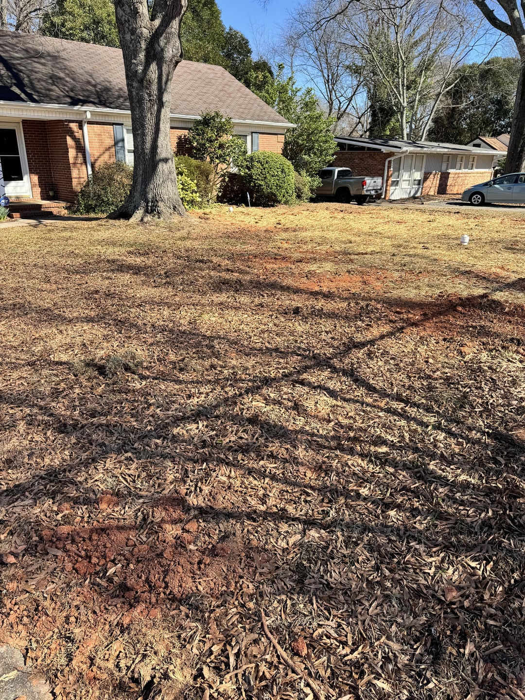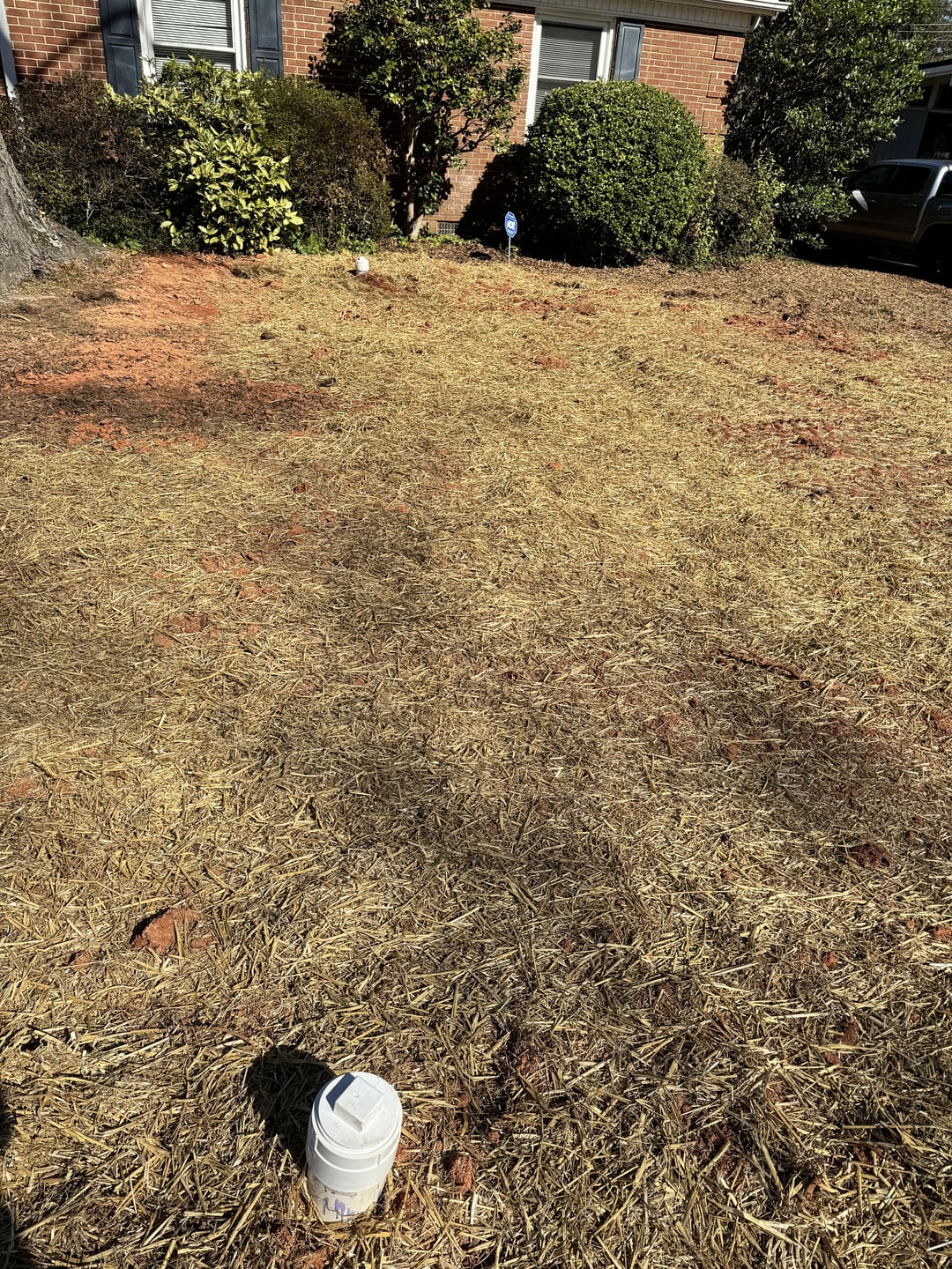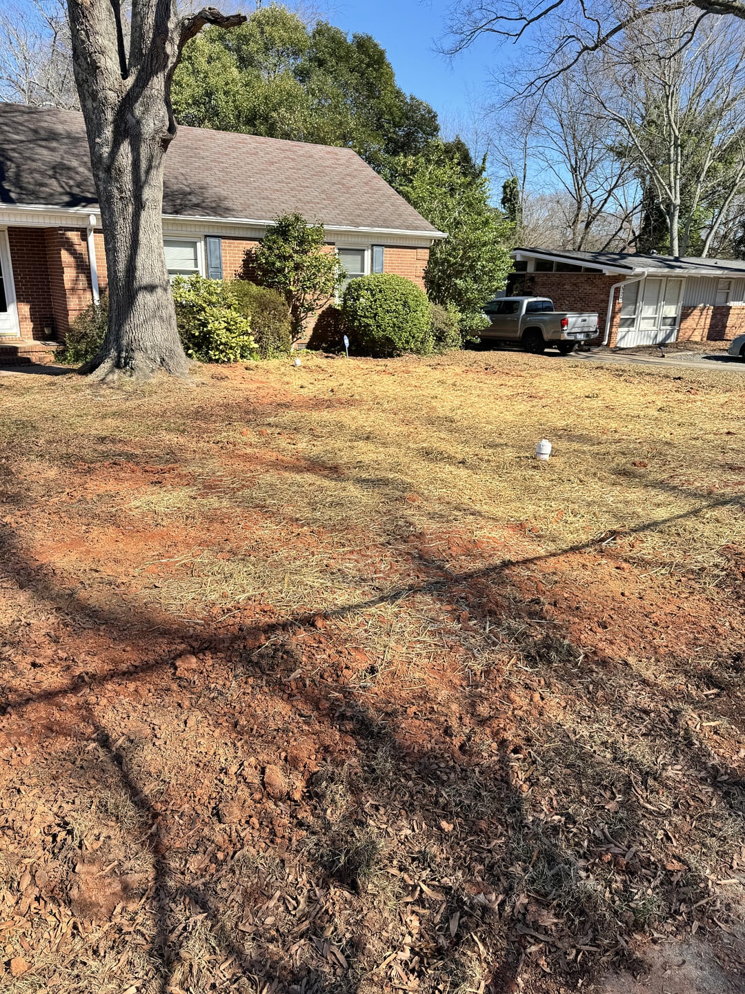 Help: How do I fix my yard after sewer line work? It was dug up and now there’s a ton of red clay I’d love to get rid of. They put down grass seeds/hay, but what can I do to make it look better by summer? (Before pics at the end.)