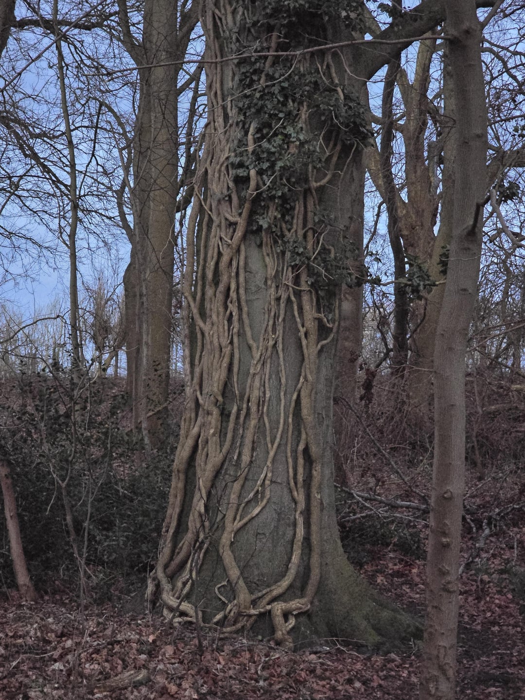 English ivy. They are not parasitic in that they don’t draw nutrients through the bark of the tree. They use the tree to reach sunlight. They do draw nutrients from the ground around the tree and they can choke out the leaves the tree uses to make energy.