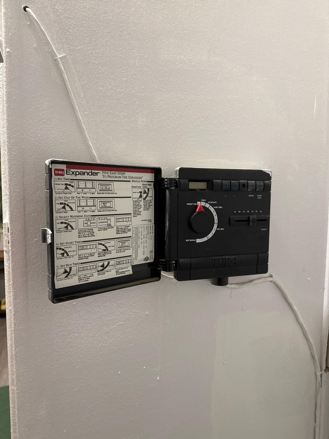 I have an older home and would love a few call outs to what’s in this photo. I believe it pertains to a former inactive irrigation system. It’s located outside of my side patio door. Second photo is a control panel. Much appreciated!