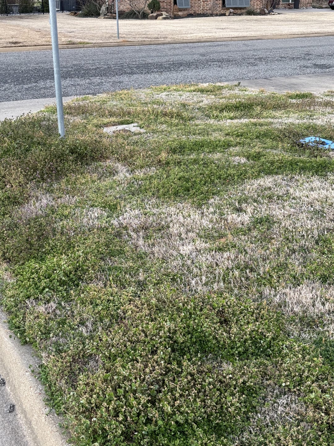 But one other area I’m not sure about… I’m noticing other new builds going up in the neighborhood by the same builder and I can see they put down sod on about 70-80% of the yard and then leave a good-sized chunk empty with just the dirt as you get farther away from the house. I’m thinking maybe the same thing was done when this home was built a couple years ago. The “main” front yard is Bermuda and looked good last season. The side yard is also mostly Bermuda, but then a big chunk seems to mostly be weeds the farther you get from the house.