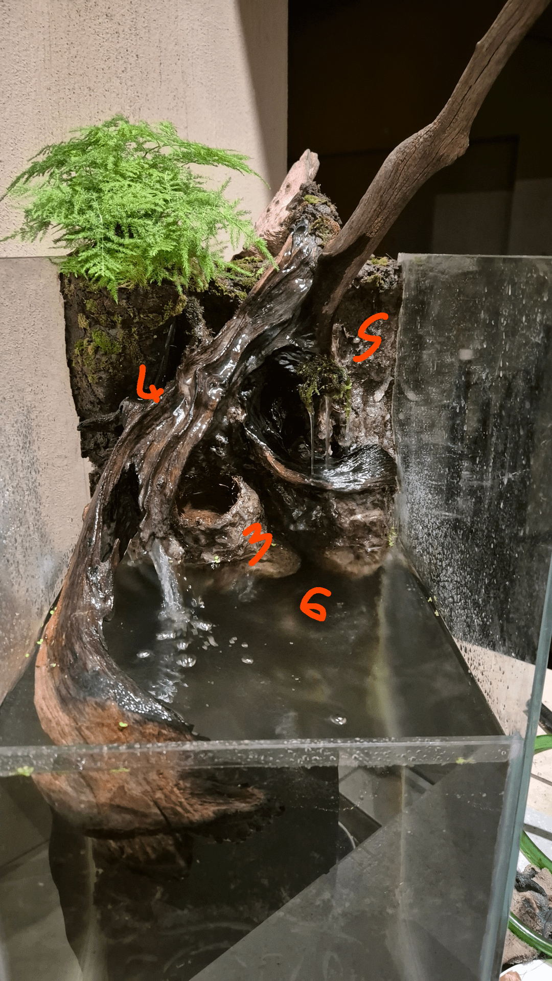 This looks soooo good!!! I canāt really give plant advice as Iām still learning and yet to actually build my first paludarium (have a few aquariums and 20+ terrariums). Iāve seen a lot of folks use silicone and coco? fiber and or sphagnum moss to cover hard scape mishaps. Oh, creeping fig is fantastic terrarium plant that would grow well above the waterline in a humid environment and if you use several āvinesā? It will cover a lot of ground (vertical or horizontal).