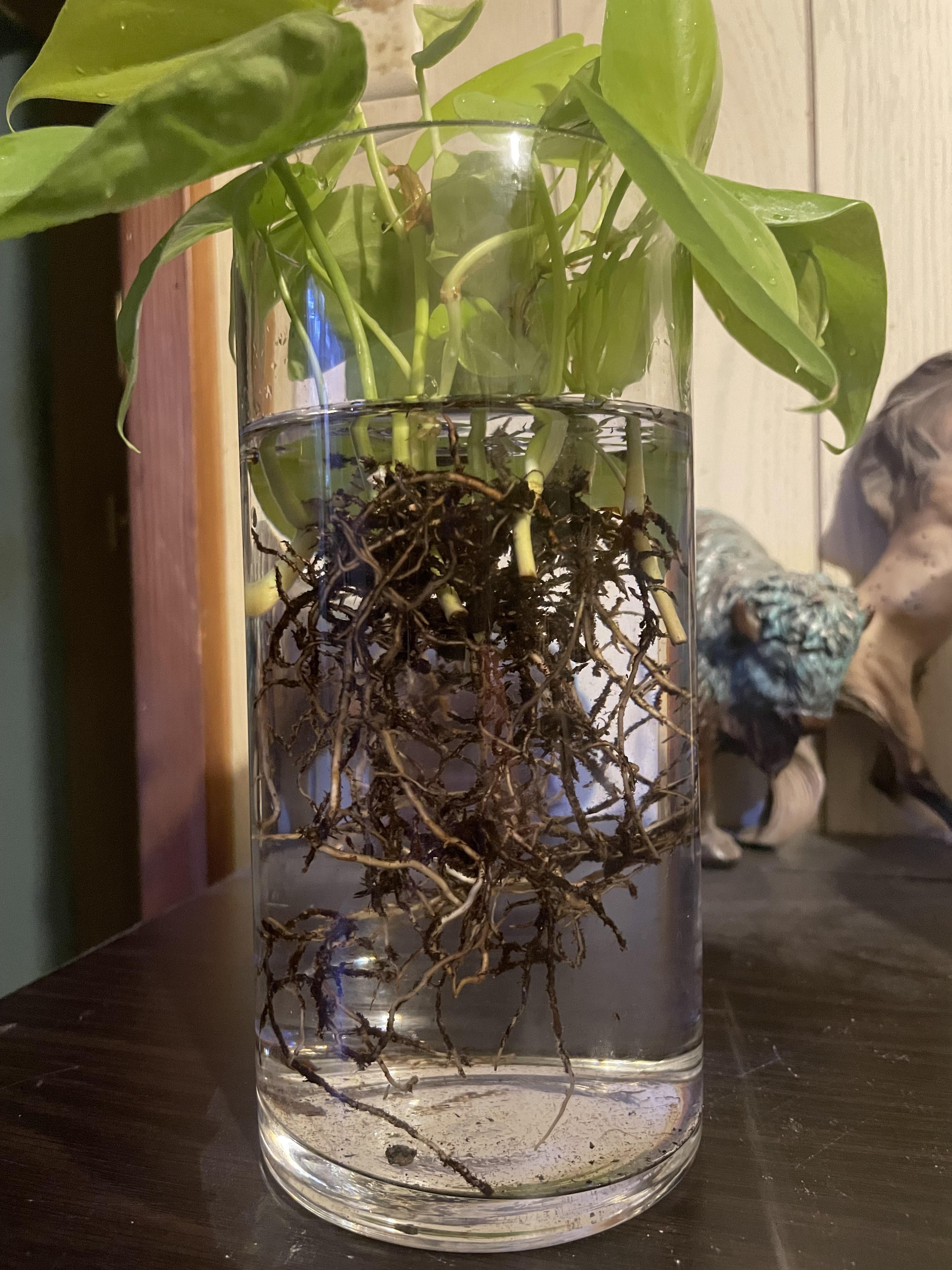 so i asked recently if i could take my pothos from dirt to water, i couldn’t get all of the dirt off so im hoping it will soak off with time. but the pot was too big and it was sad looking. and i thought since my other pothos are thriving in my fish tank why not take that water and put it in a vase to see if it will live better in here, i do however have one single pothos in dirt and it seems to be living, but its a pot that fits the pothos.