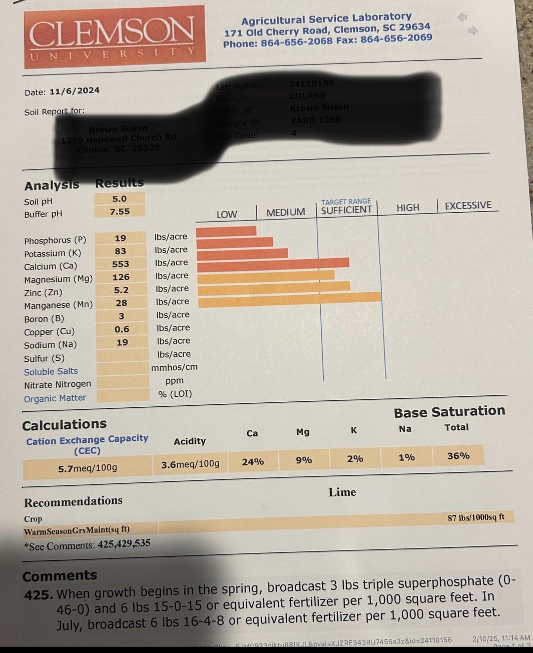 Starting with lime, which is directly above the comments section on the bottom of the report. Clemson is recommending 87 pounds per 1,000 square feet.