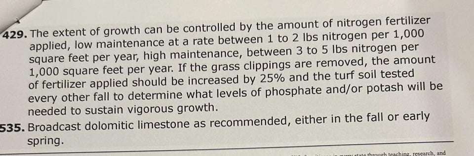 For lime, I see 87 lbs per 1,000 sq ft. That’s a lot of lime, so split this into multiple applications over a few years.