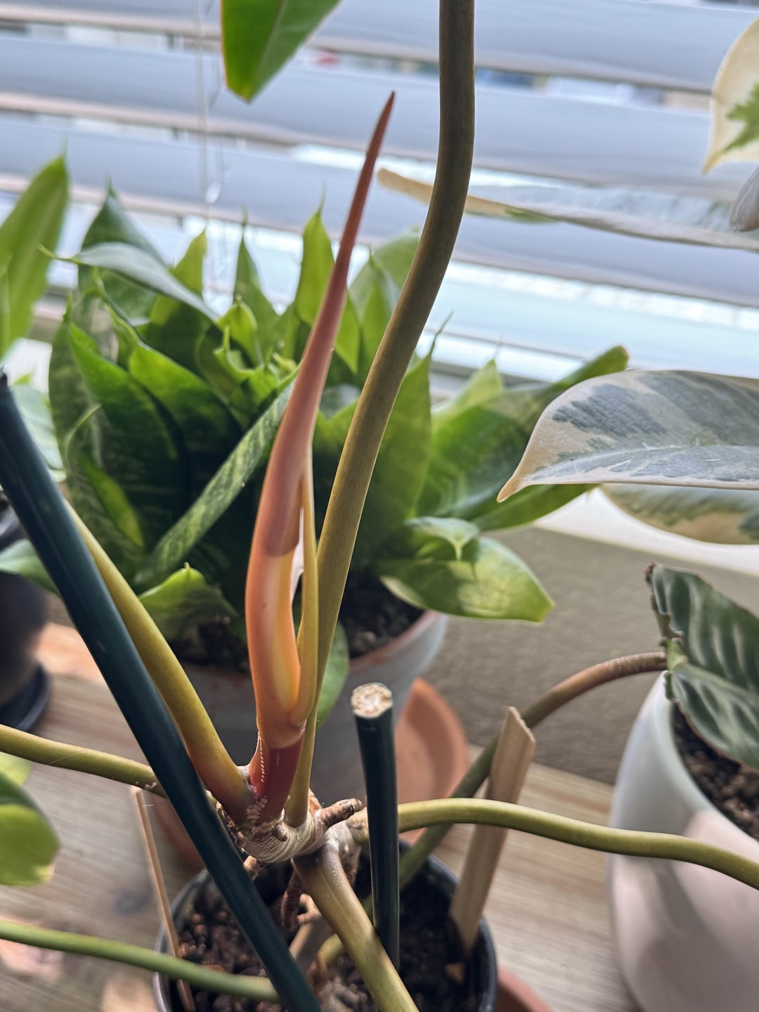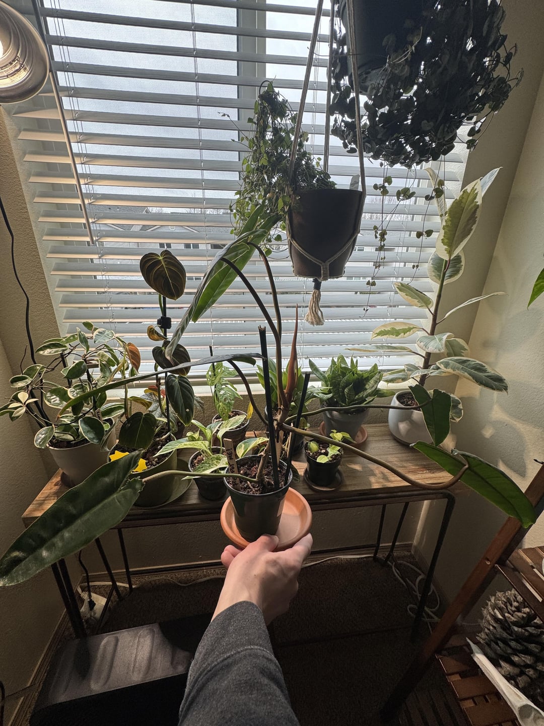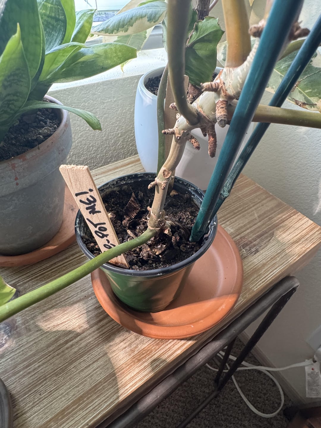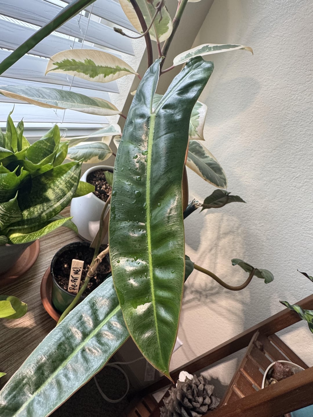 Bought this guy about 8 months ago and still haven’t gotten around to potting it up. Whoops, started with 3 little leaves and it hasn’t lost a leaf on its own yet (I snipped two cause it got lanky and it kept crowding it’s neighbors). It’s growing on me now, didn’t like its habit at first but it’s got charm!