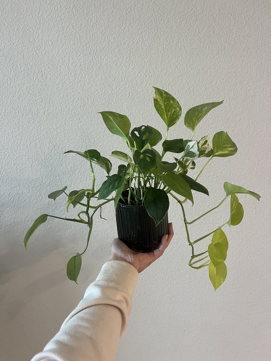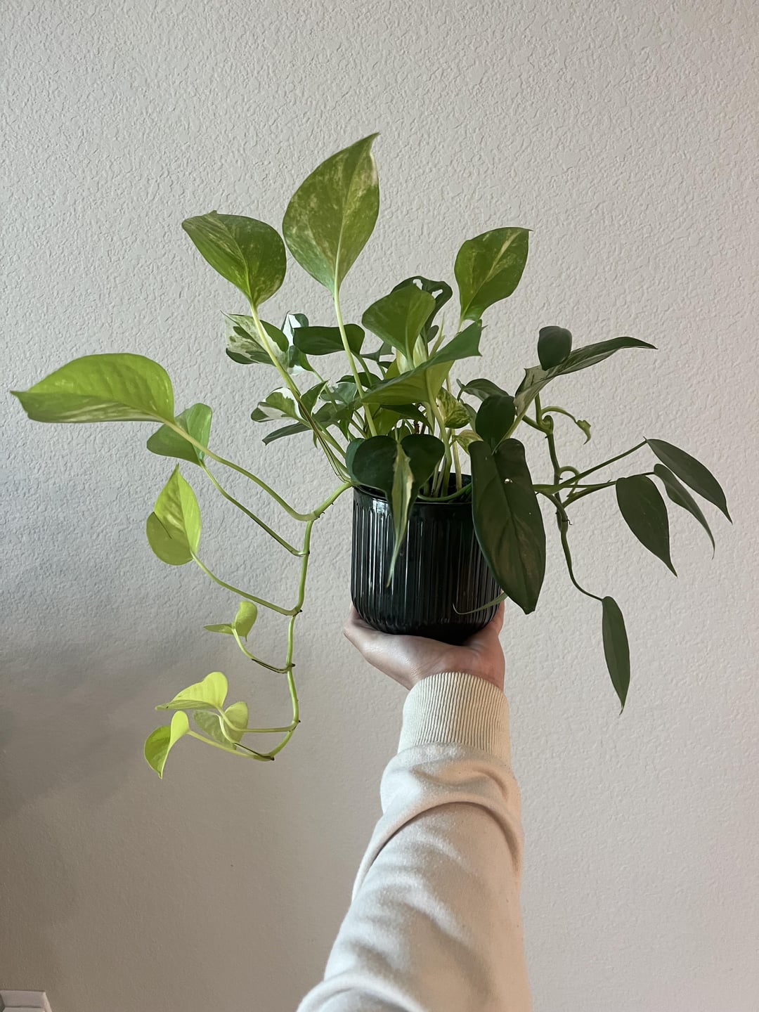This girl is super long, but I just put her in a bigger pot, and Iâm propagating some of her clippings to make her look fuller. She was in a 7 inch pot and sheâs 5 feet long. She would have been happy in that pot for a while still, but sheâs still tiny compared to to my other pothos plants.