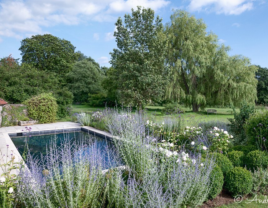 Summer days at our #garden for a farmhouse in #somerset – the #perovskia looking great against the #swimmingpool and the #countryside beyond.