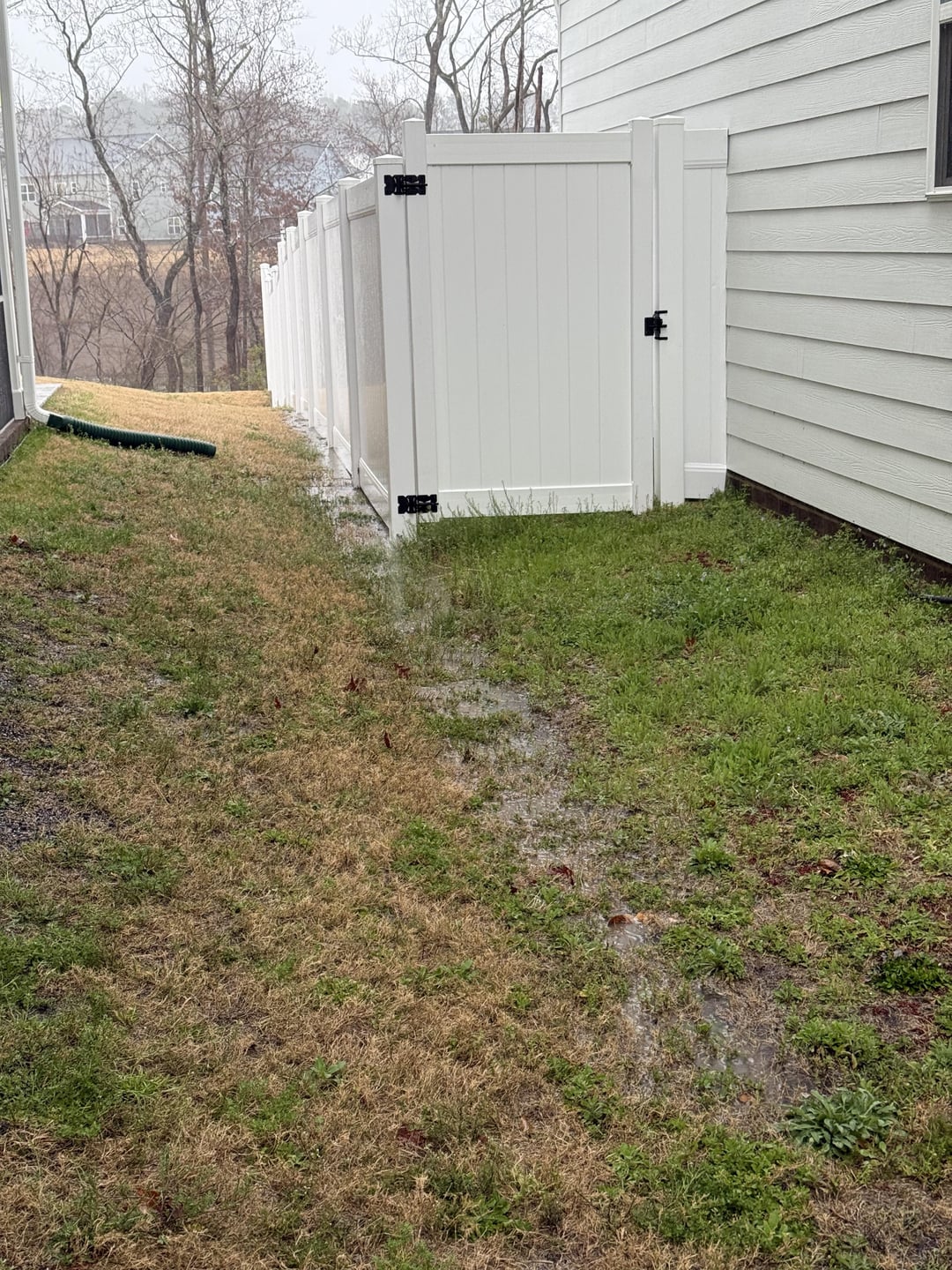 Note this line. Either dig in a trench and line it with drainage material and cover back with grass, or get river rock for that low point.