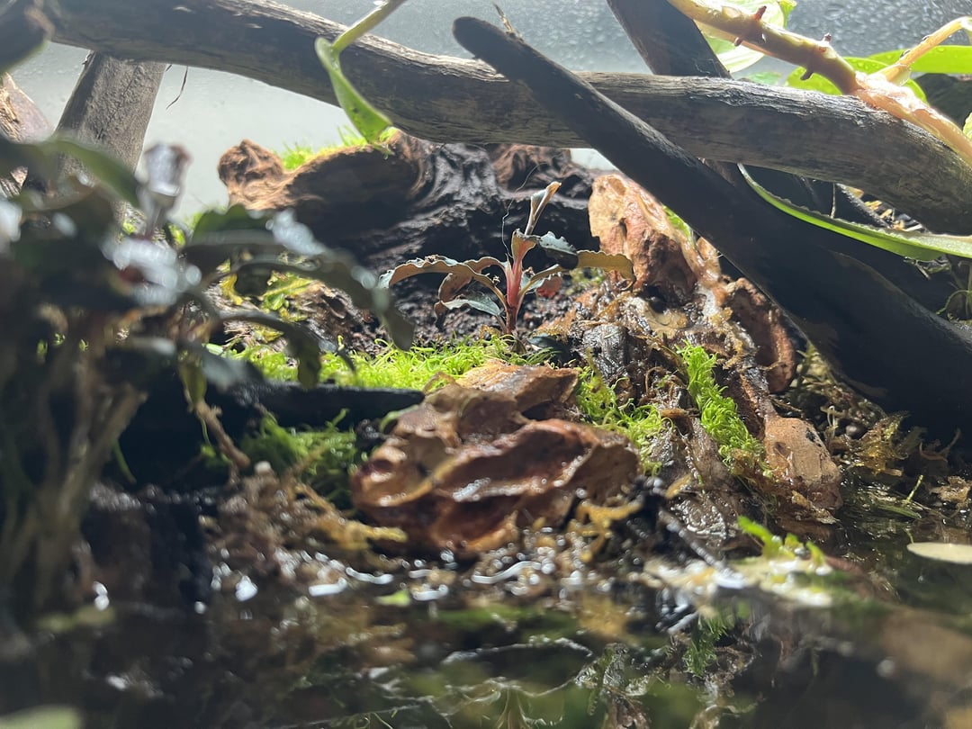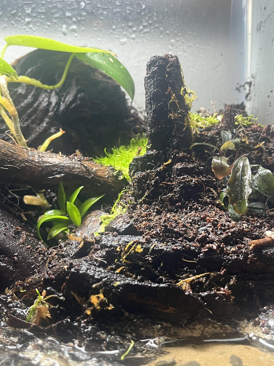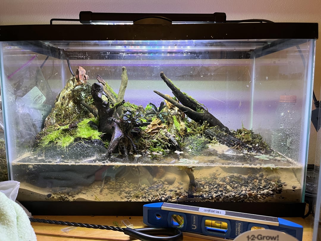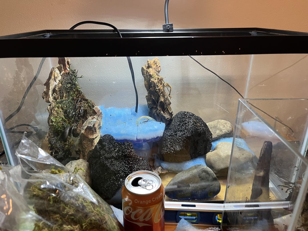 Planning on doing vampire crabs and dropping the water level slightly. I used leca in the bottom of the land section up to the water level, capped that with sphagnum moss and then topped that with some bioactive ready substrate. Finally added springtails last night to help with any mold. Tossed a few ramshorns snails in from my adf tank and they seem to be loving the lack of frogs going after them. Plan on adding more moss and some more terrestrial plants. The only thing I’m slightly concerned about is not having enough depth in the dirt section for the crabs to burrow in. Because it’s a ten gallon I want to make sure there’s ample space to hide. I only plan on getting 3 whenever my tank is cycled enough. I’d say there’s about an average depth of 2 inches, deeper in some spots and shallower towards the water line because of the rocks holding everything in place. Any tips or tricks greatly appreciated! Some WIP pics included.