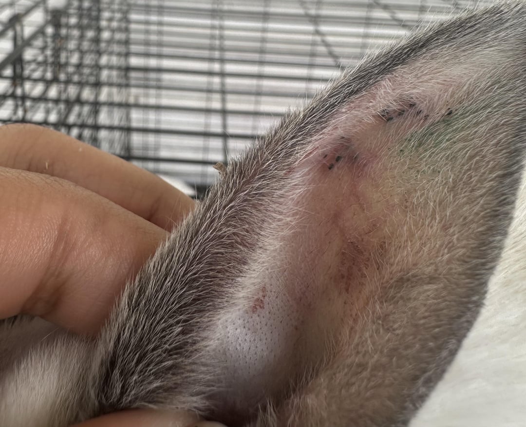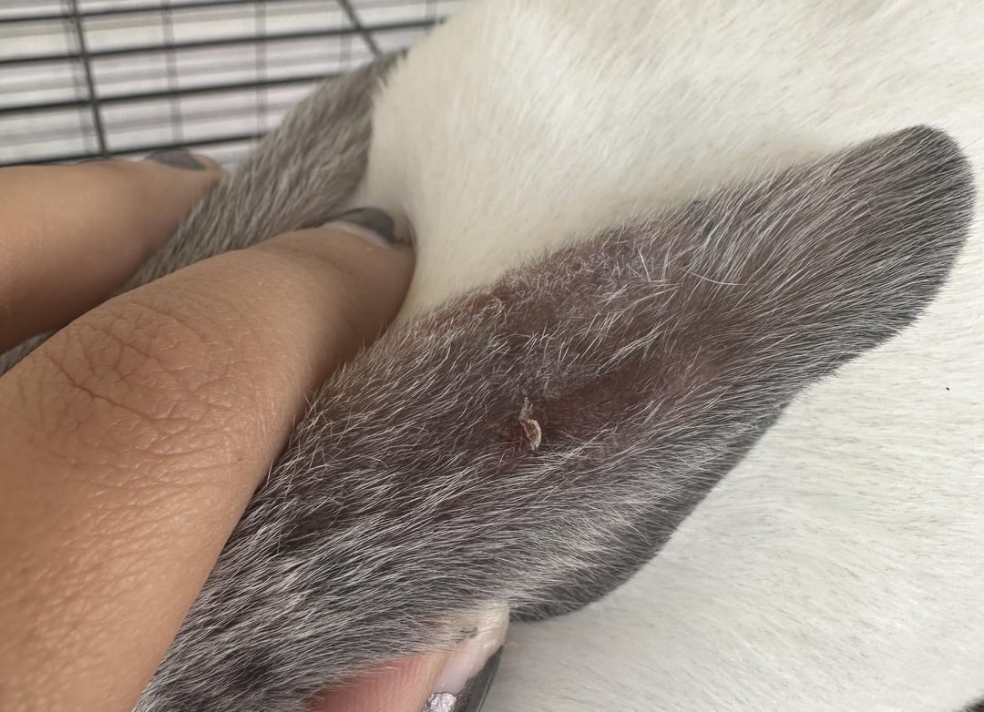 These are my meat rabbits for FFA and I noticed one of my bunnies have a peeling on his ear, they’ve only been with me for a week and I got them from a breeder… I don’t know what it is , it may be from stress and he chewed on his ear or maybe the tattoo ink? Could it be ear mites? Is there any ointment I can use to maybe make it better? Lmk 🙏