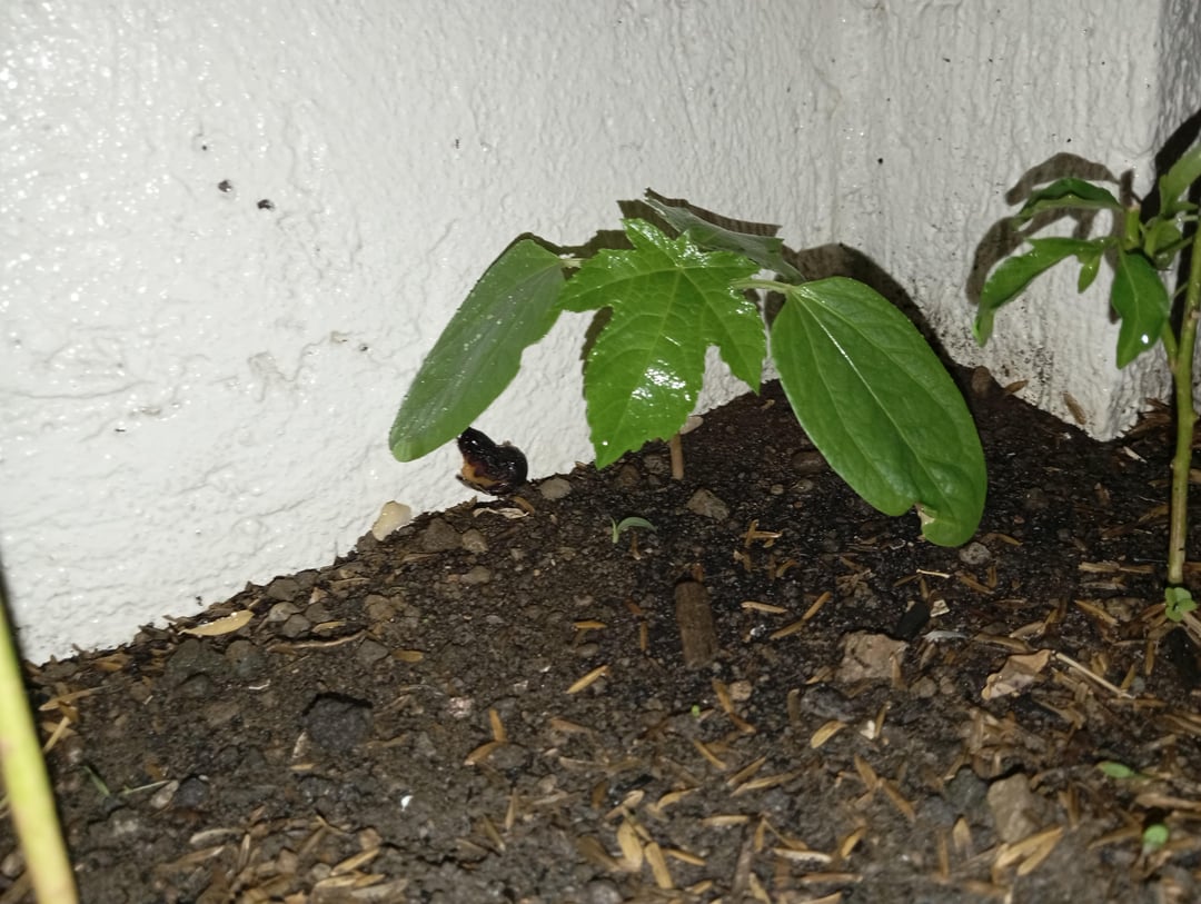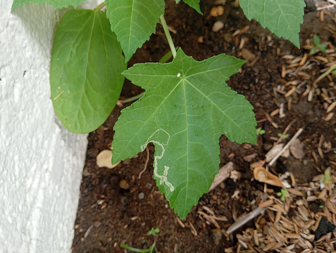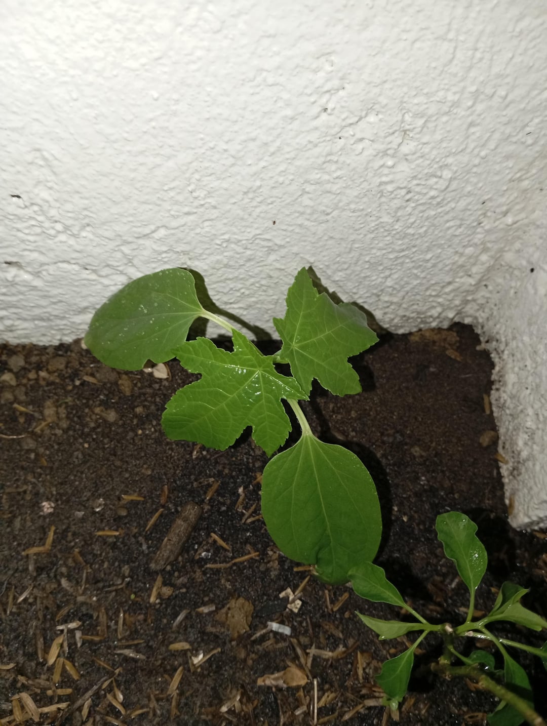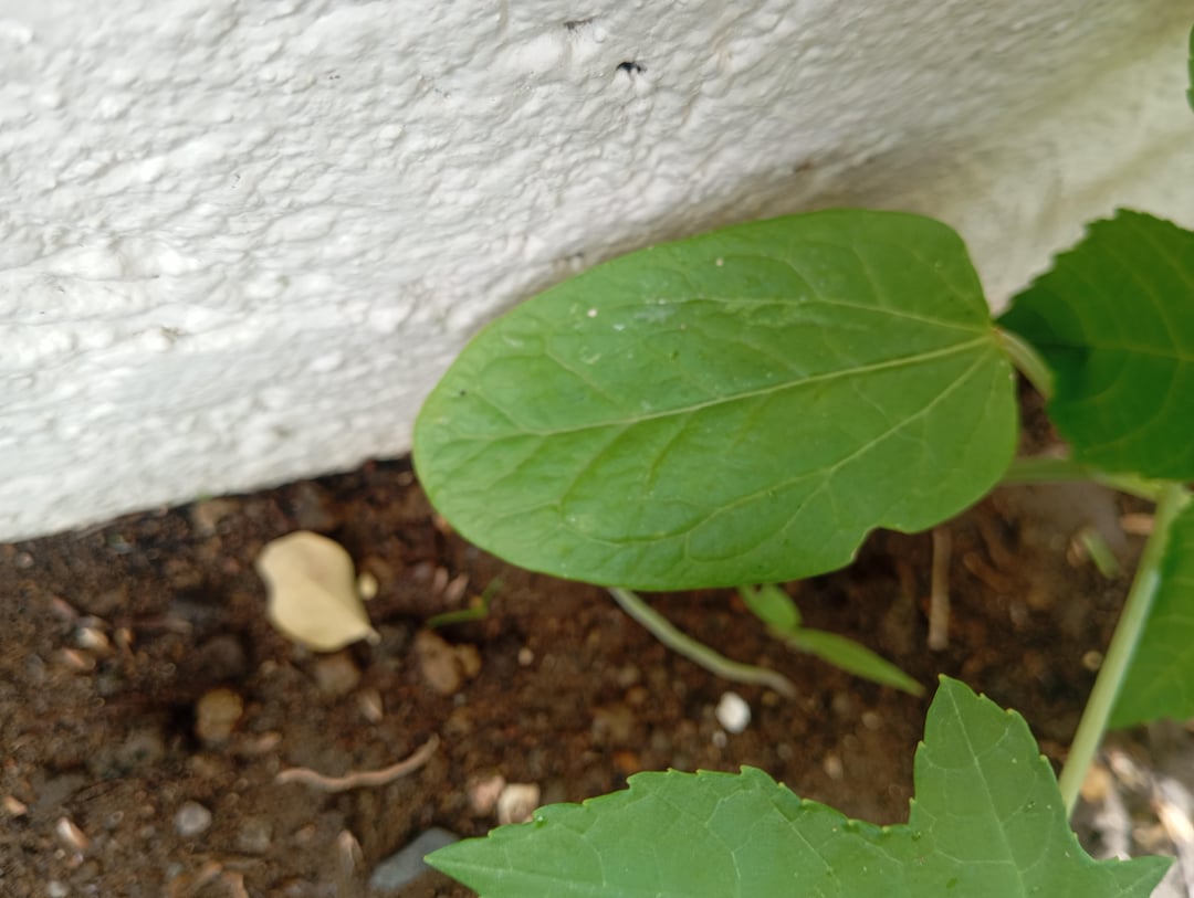 *Ricinus communis,* aka Castor bean. The oval leaves are the first two leaves to form on the plant and frequently don’t look like the mature plant. Those initial leaves eventually die off.