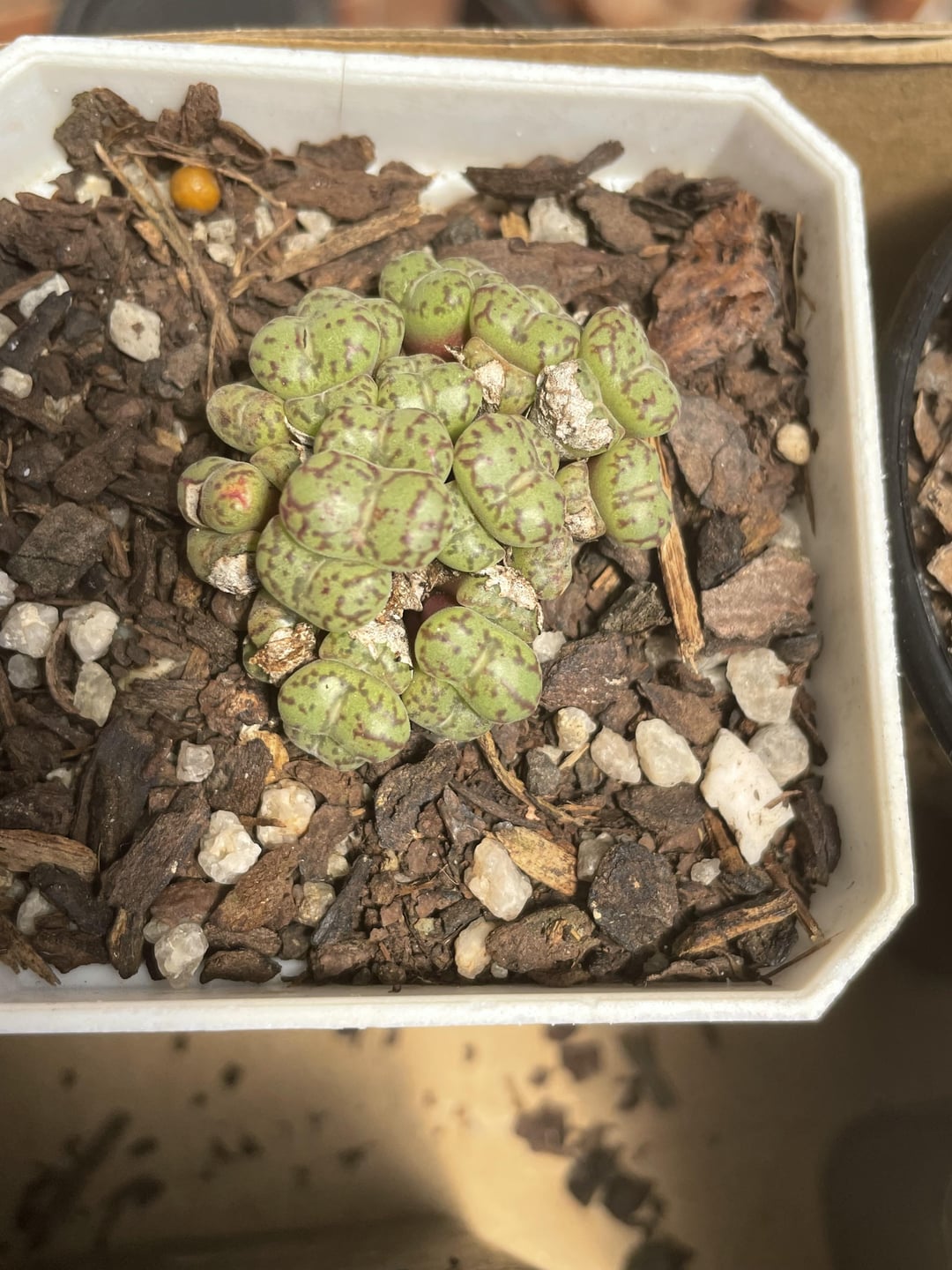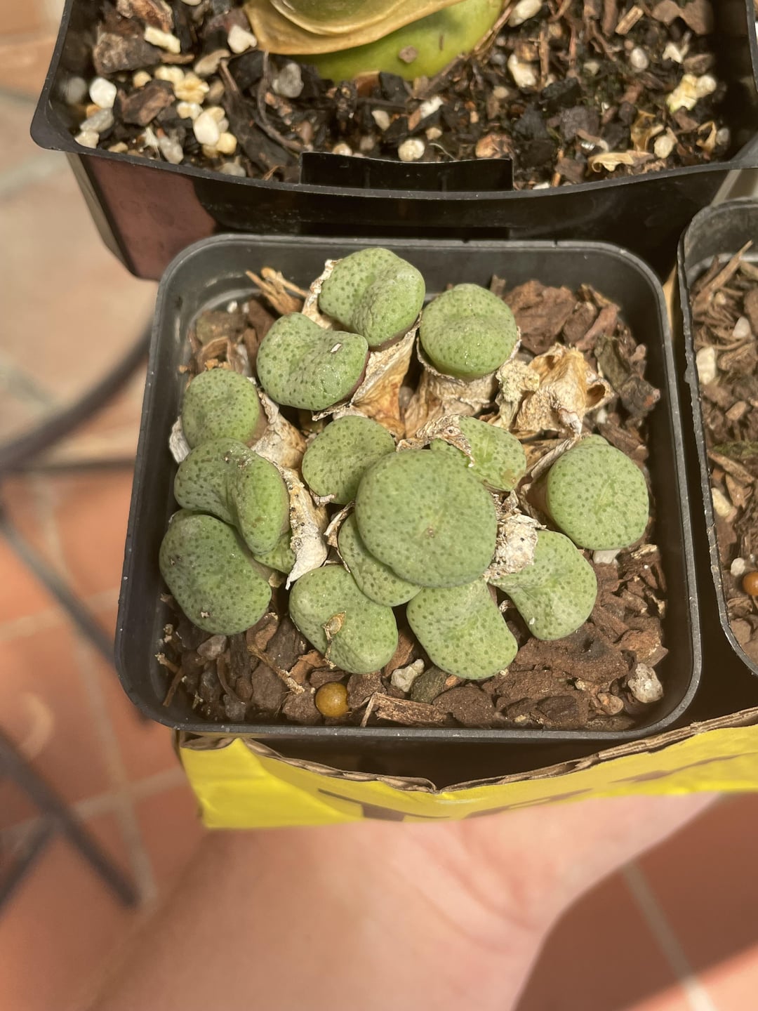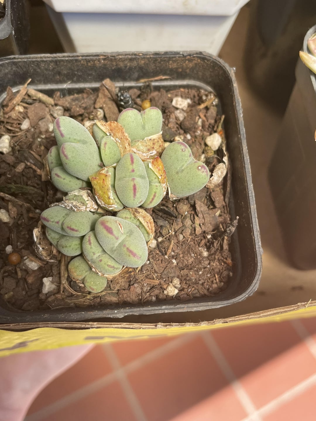 GoatLegRedux 8 months ago 1 and 4 both look like Conophytum obcordellum ssp. rolfii. 2 and 5 look like Conophytum meyeri (bilobum ssp meyeri) Not sure about the other ones. Edit: ooos, just noticed there’s only three, each with a before/after shot.