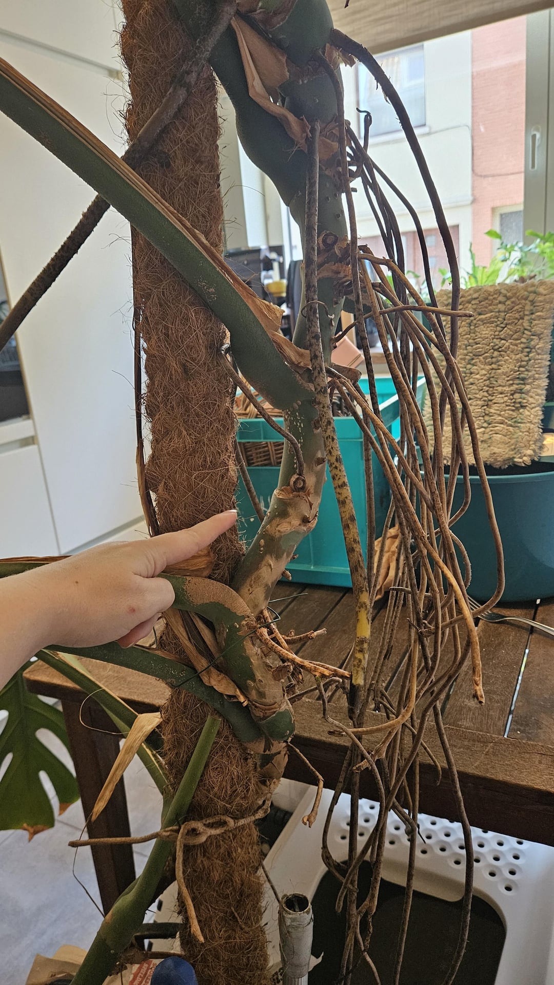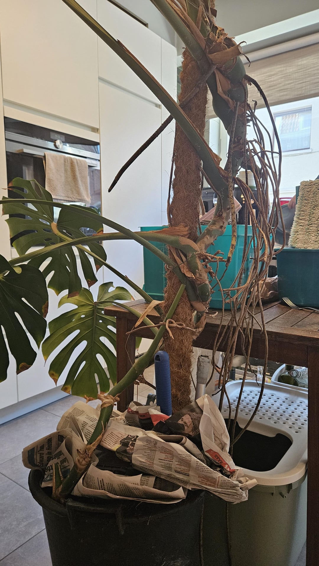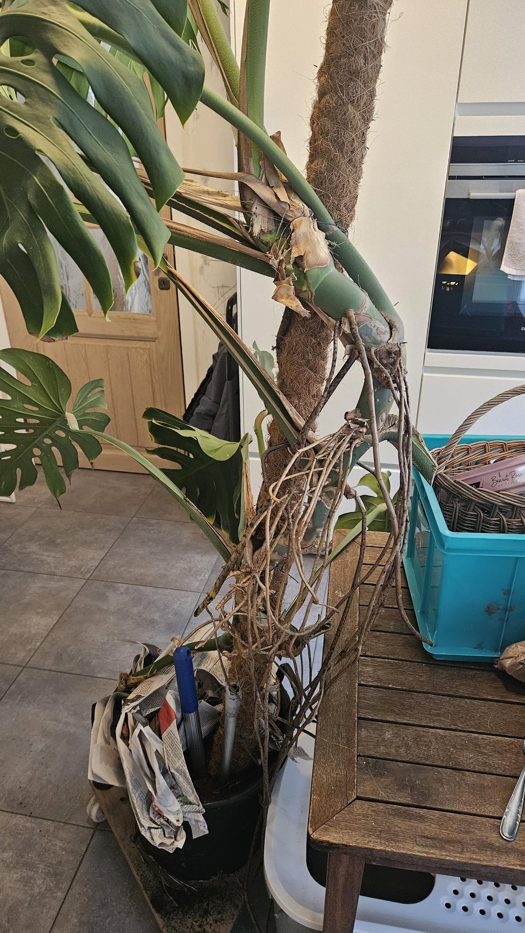 I recently came into the posession of a big monstera. It has 4 unhappy leaves at the bottom, a lot of places along the way leaves have been cut off and a very heslthy top with aerial roots.