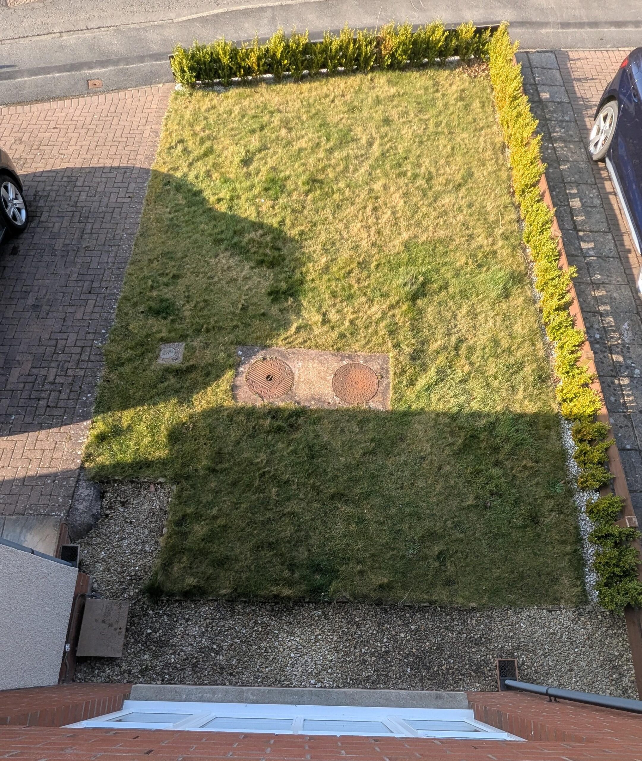 I’m also in Scotland with a similarly boring front garden that doesn’t need to be lawn, so here’s my plans. I’d love to put a couple of fruit trees in mine for the sake of growing more of my own food (I’m putting apples in the back and ideally plums on the front for variety) and also giving me a bit more privacy from the road. The problem with trees is making sure the roots don’t mess with the drains. Judging by the positions of the manholes in your lawn and the ones on the street, if your drains go under your garden straight to the street at 90° to your house you may not be able to place the trees safely, but if they cut the corner and connect to the main waste pipe at the little manhole in front of your drive (and particularly if you’re on a bit of a hill I think they might), I would go with fruit trees as a starting point. There’s a supplier of local heritage fruit trees that I was recommended https://www.scottishfruittrees.com/