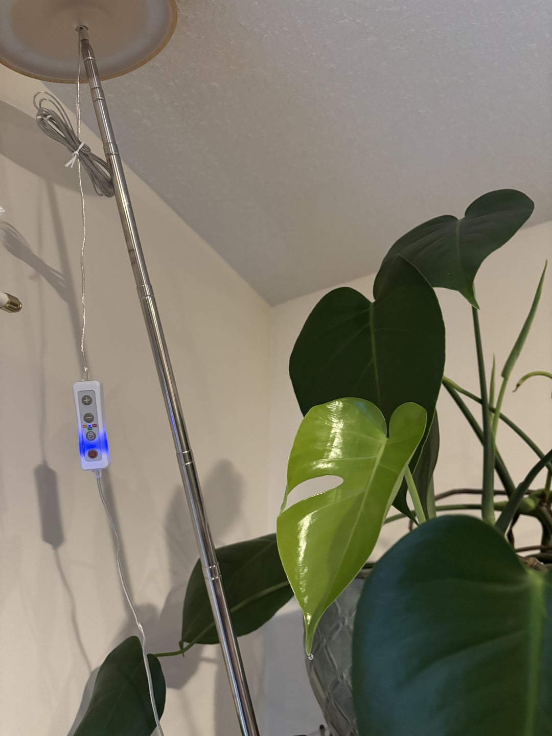 Set up is still not ideal, I’m doing some light measurements throughout the house and will move accordingly along with something for the poor thing to climb. But she is at least happy enough to put out a fenestrated leaf!!