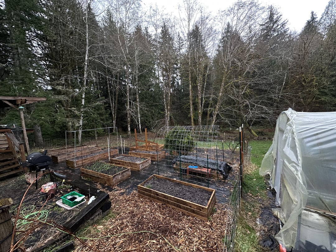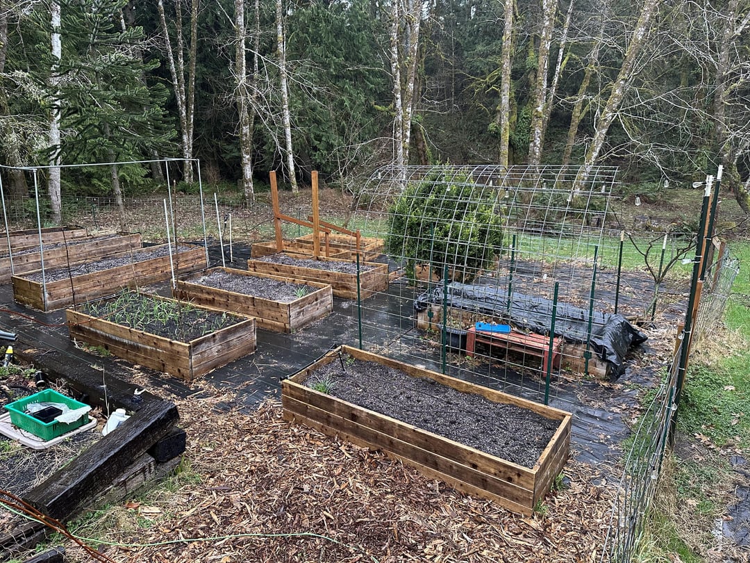 Can’t decide if I should spread hardwood chips between all the raised beds. On the one hand, the black plastic is uglier than wood chips. On the other hand, the wood chips would capture dirt and leaves and seeds and would decompose with time and eventually I’ll have soil all between my raised beds and plenty of weeds, which was what I was originally trying to avoid. Also, wood chips will make pulling a wheel barrow heavy with dirt more difficult. Thoughts?