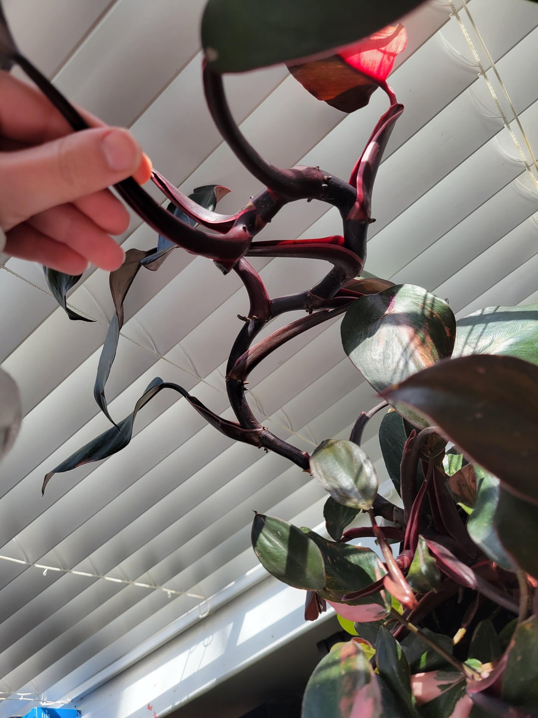 I have neglected them for too long 😭 I just put my white wizard on a moss pole and he's pretty crooked but I think he'll grow straight with proper light? The pink princess however… I'm not sure if that's even doable. Should I just chop and prop? Or try to bend it slowly?