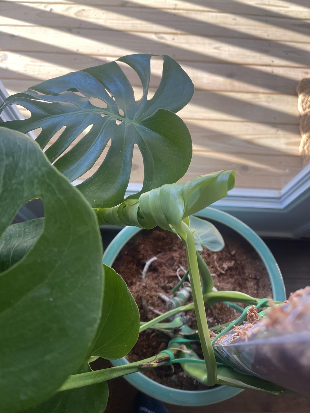 So many fenestrations!! Gentle reminder to make sure you are securing the internodes, not the petioles, since they need to be able to move them around, and tying them down won’t help them climb! The pole should be behind the Monstera rather than the front 🫶🏻