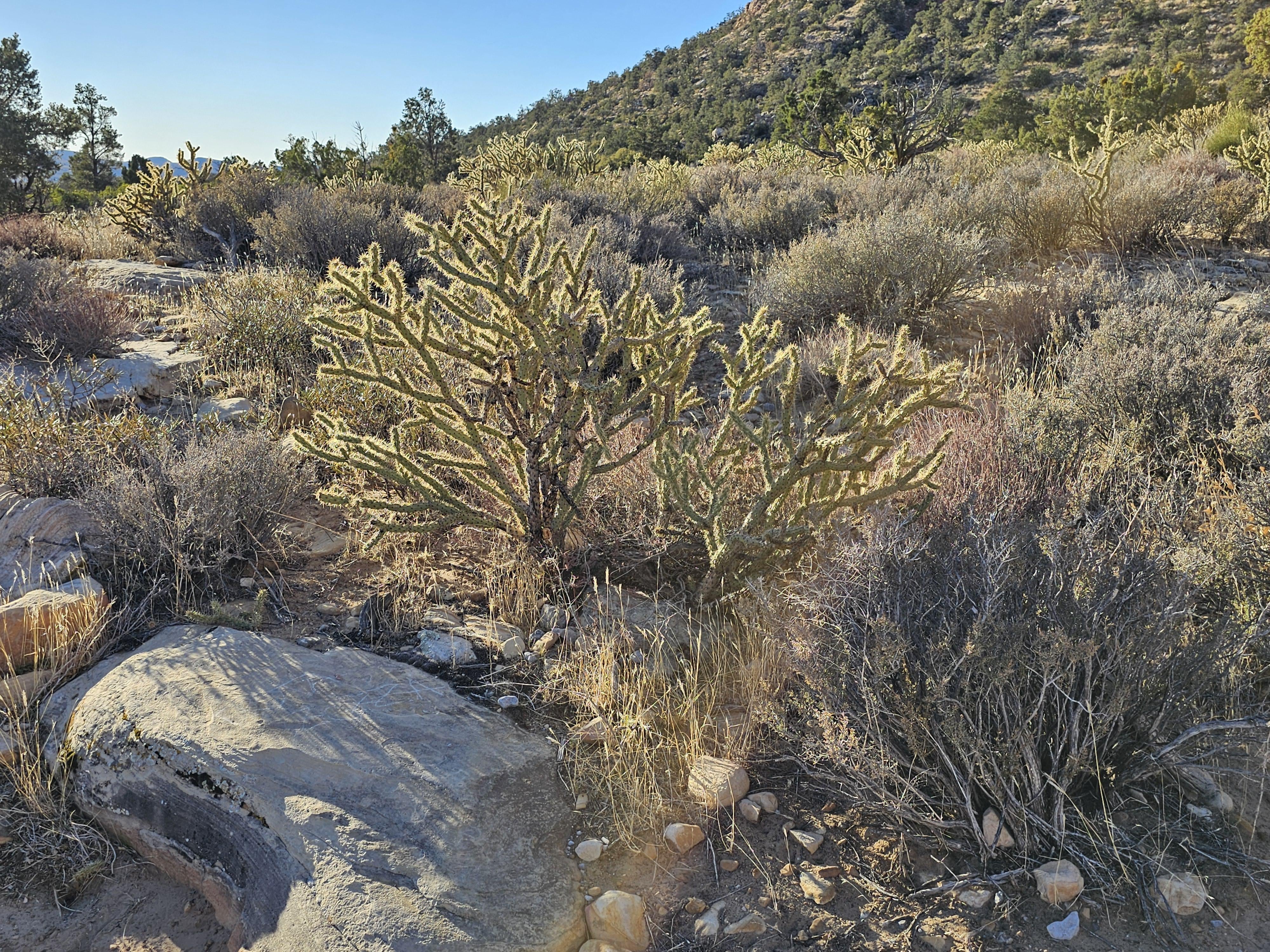 Cholla, nicknamed the jumping cactus because those segments will stick in you with just the softest brush by and separate from the plant immediately so it seems like it jumped on you. (Pronounced choy-ya.)