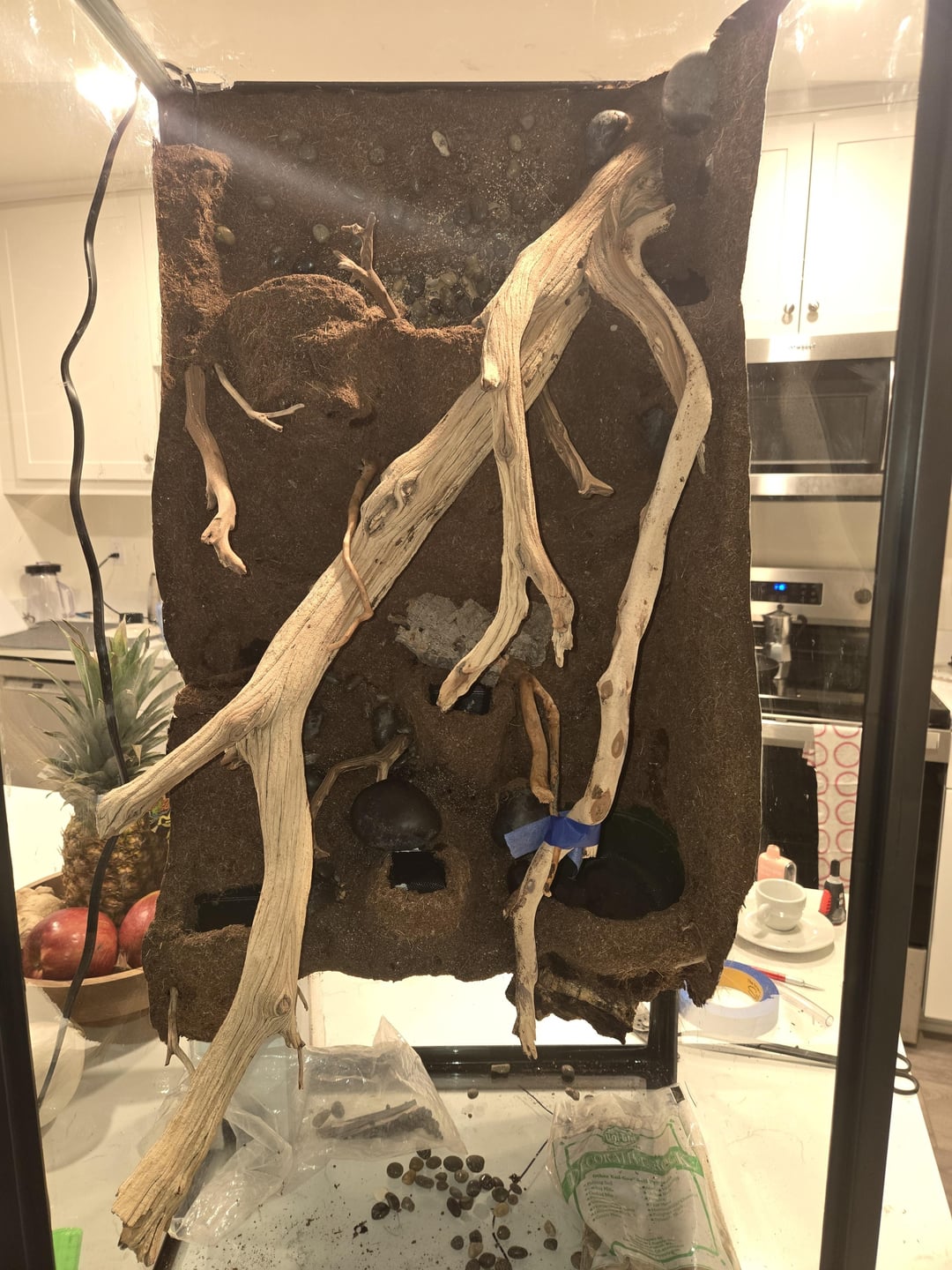 I know I want some hanging plants near the top to drape down and fill some areas in. I have a kind of filter built in to the waterfall housing that includes filter floss and lava rock. The water will be heated to 78 degrees F. to mimic an actual aquarium at the bottom and I'm looking to add some livestock. The main livestock this build is for is 2 Whites tree frogs. This is a converted to vertical 40 gallon breeder aquarium with a Iheartgeckos front door. Let me know what you think, suggest or anything else!